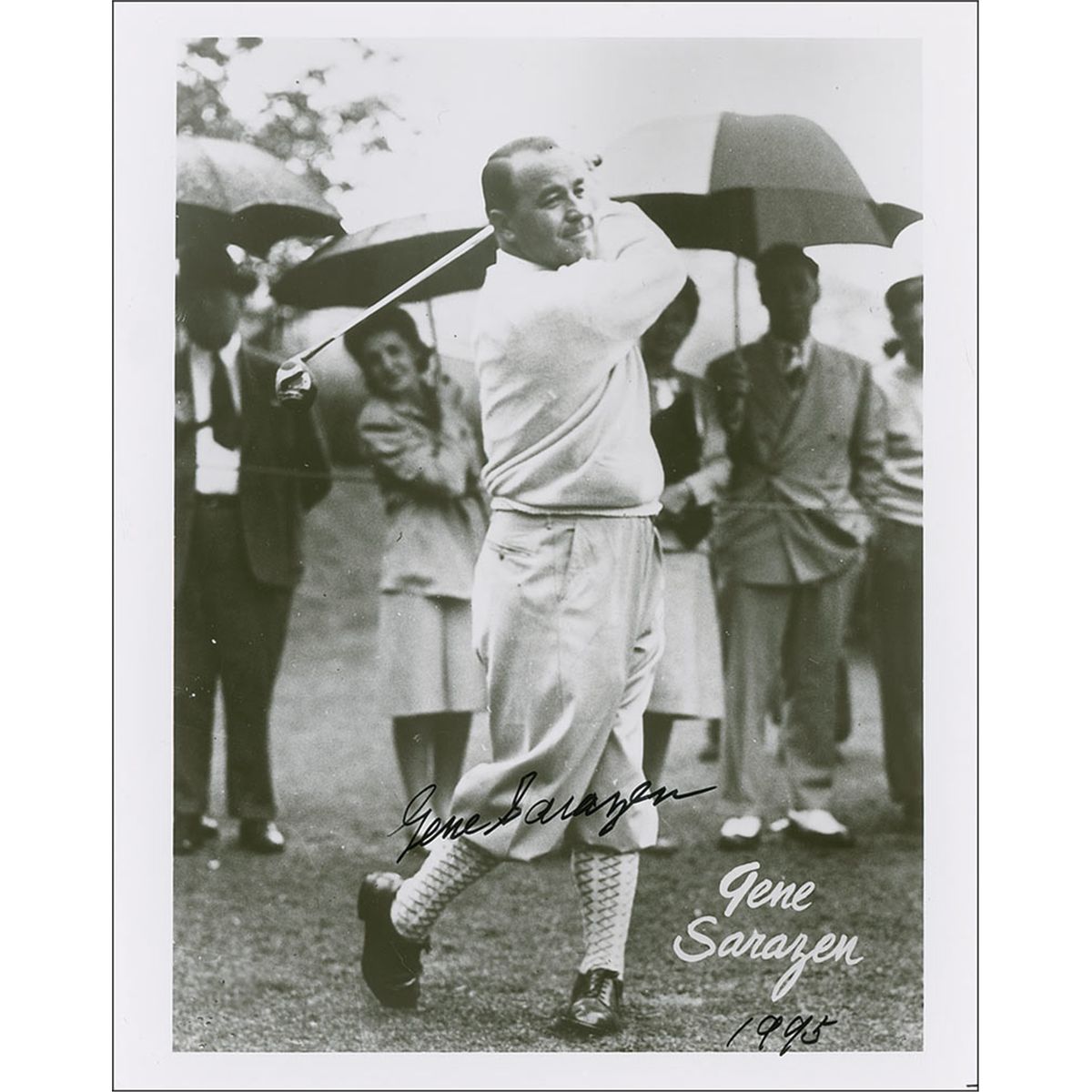 Glossy 8 x 10 photo of Sarazen teeing off in the rain, signed in black felt tip, “Gene Sarazen, 1995.” In fine condition, with a few trivial creases.