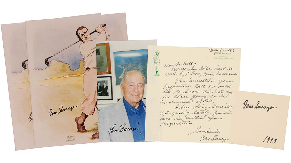 Five items: two identical color satin-finish 8 x 10 photos of an artist’s impression of Sarazen, both signed in black felt tip; a color glossy 5 x 8 photo signed in black felt tip; a felt tip signature, “Gene Sarazen 1993,” on an off-white 4.5 x 4.25 slip; and a handwritten 1993 ALS on his own personal stationery, one page, 7.25 x 7.5, regarding a business proposal. In fine overall condition.
