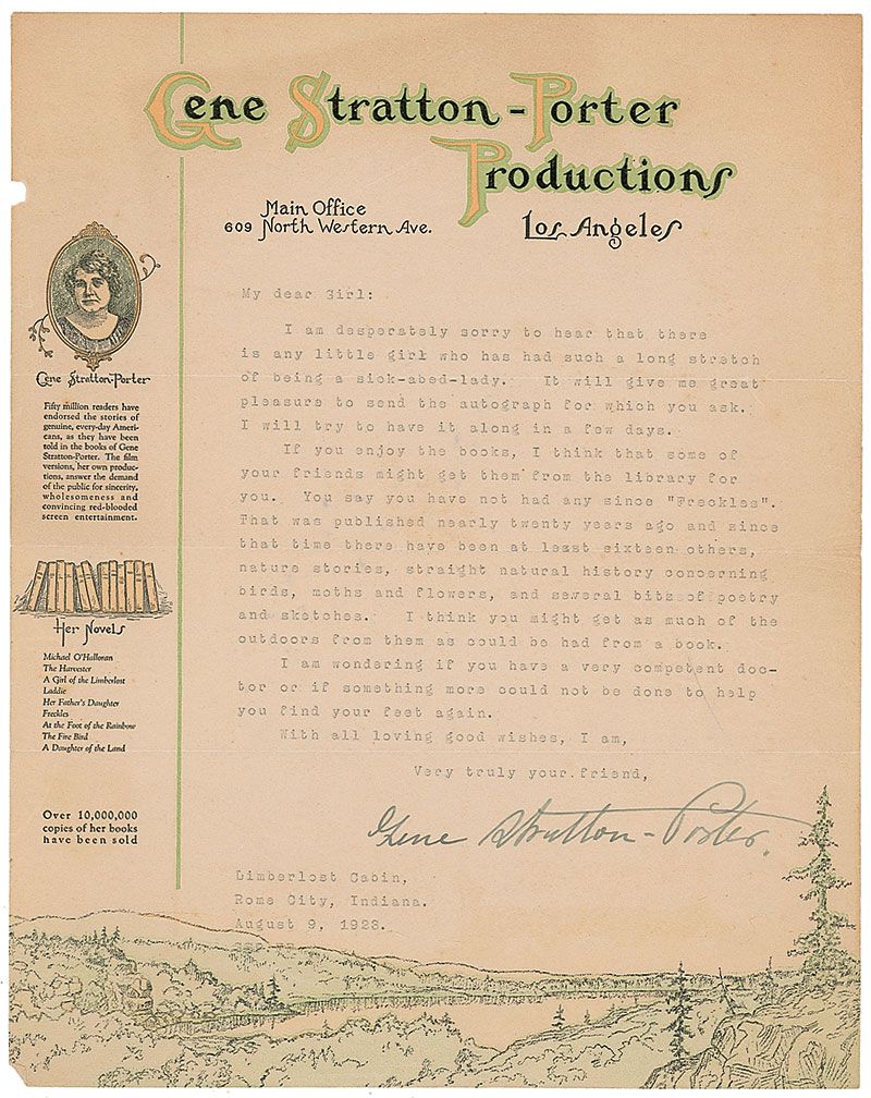 American author and naturalist (1863–1924) whose novels include Laddie, Freckles, and A Girl of the Limberlost. TLS, one page, 8 x 10, ornate Gene Stratton-Porter Productions letterhead, August 9, 1923. Letter to a sick young girl. In part: “If you enjoy the books, I think that some of your friends might get them from the library for you. You say you have not had any since ‘Freckles.’ That was published nearly twenty years ago and since that time there have been at least sixteen others…I am wondering if you have a very competent doctor or if something more could not be done to help you find your feet again.” Some scattered light toning and creasing, and a small chip to left edge, otherwise fine condition.