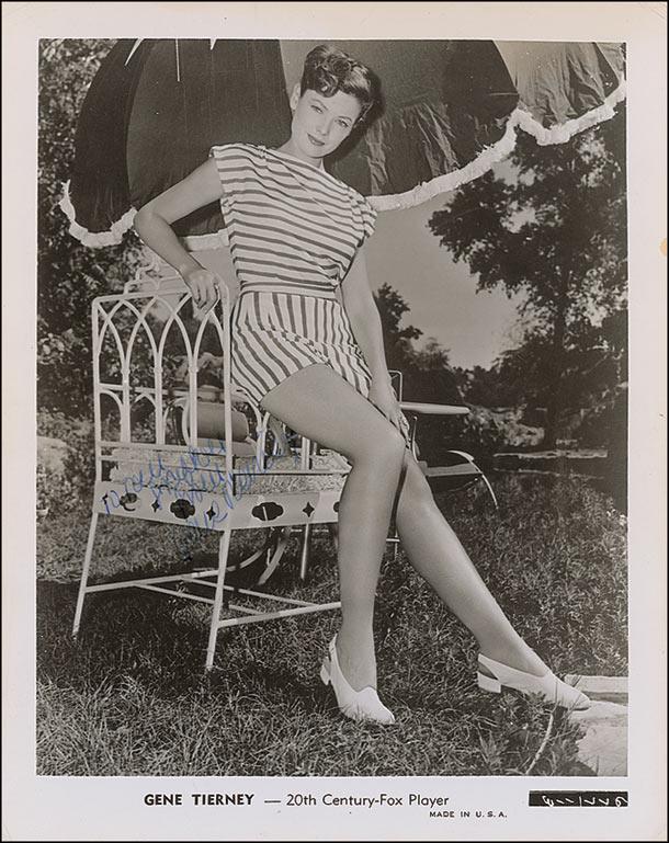 Glossy 8 x 10 20th Century Fox publicity photo of Tierney posing outdoors, signed and inscribed in blue ink. In very good condition, with scattered creases and surface marks and some light contrast to signature and inscription.