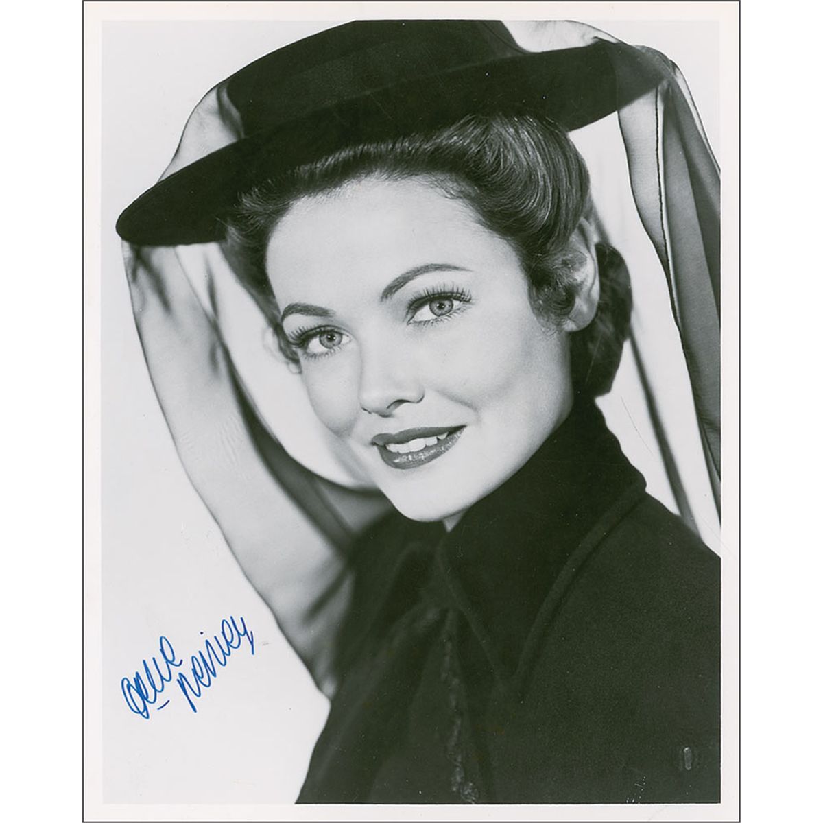 Pretty glossy 8 x 10 photo of the actress in an overcoat and hat, signed in blue felt tip. In very fine condition. This photo is from The Ghost and Mrs. Muir a beloved film and perhaps her most famous along with Laura.