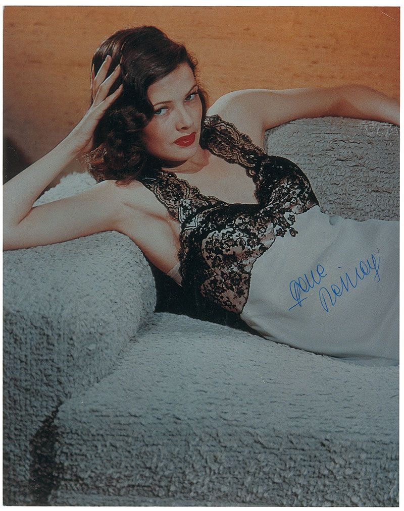 Color satin-finish 8 x 10 photo of Tierney lying on a couch, signed in blue felt tip. In fine condition, with some light creases to top corners and edge.