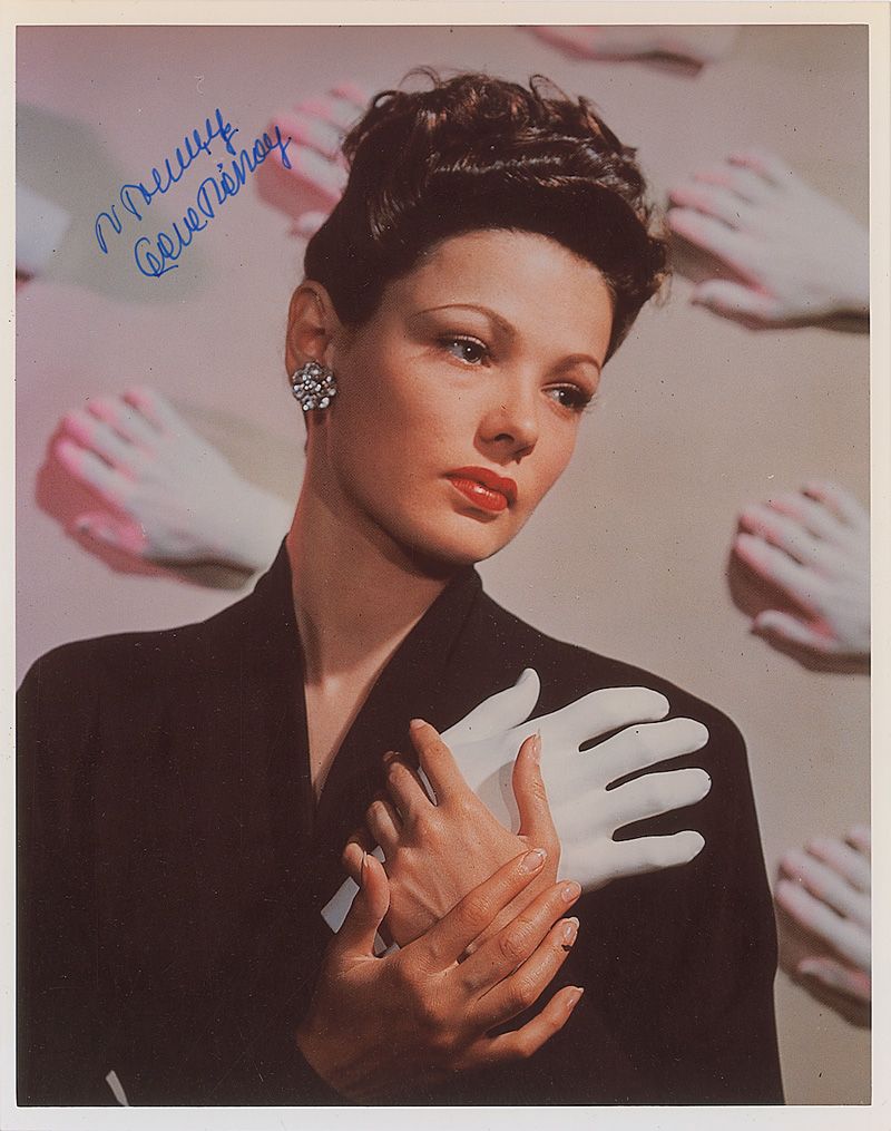 Color glossy 8 x 10 photo of Tierney holding a disembodied hand, signed and inscribed in blue felt tip “To Tommy, Gene Tierney.” In fine condition.