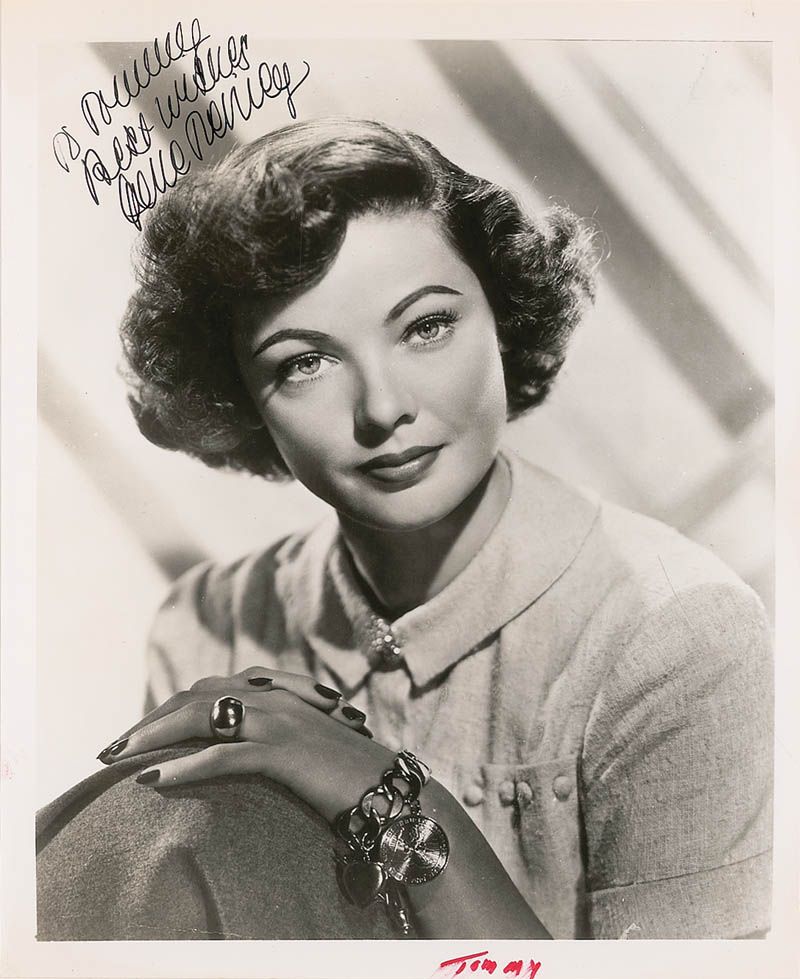 Glossy 8 x 10 photo of Tierney with her hand on her knee, signed and inscribed in black felt tip “To Tommy, Best wishes—Gene Tierney.” In fine condition, with binder dings to left edge and a red felt tip notation in the bottom border.