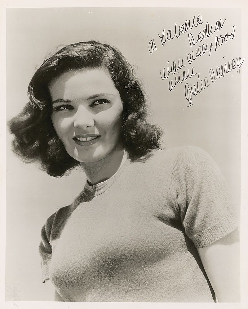 Attractive glossy 8 x 10 photo of Tierney, signed and inscribed in black ink, “To LaVerne Decker, with every good wish, Gene Tierney.” In fine condition.
