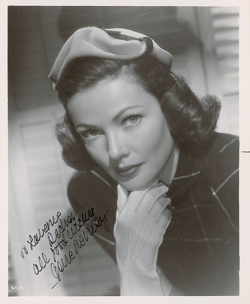 Glossy 8 x 10 photo of Tierney with her gloved hand on her chin, signed and inscribed in black felt tip, “To LaVerne Decker, all good wishes, Gene Tierney.” In fine condition.