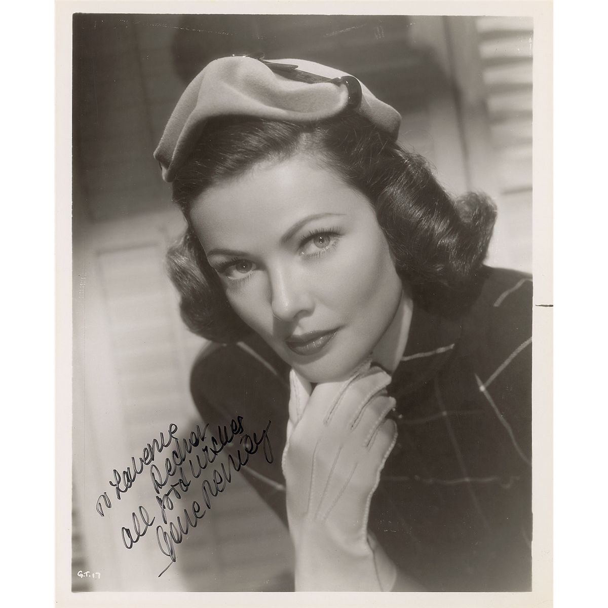 Glossy 8 x 10 photo of Tierney with her gloved hand on her chin, signed and inscribed in black felt tip, “To LaVerne Decker, all good wishes, Gene Tierney.” In fine condition.