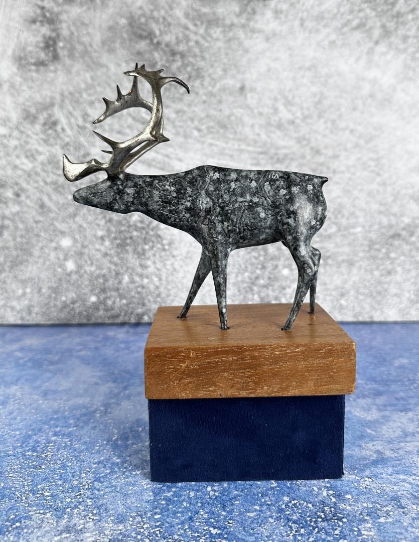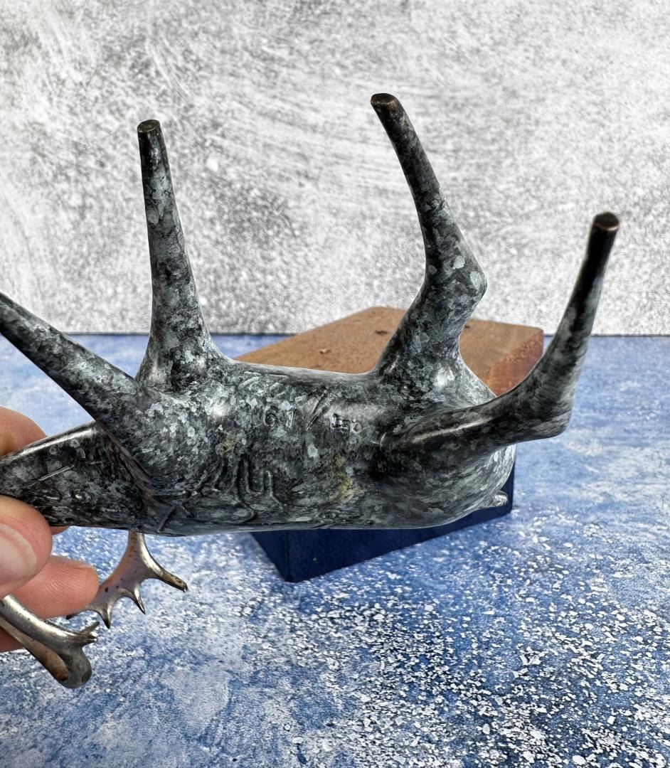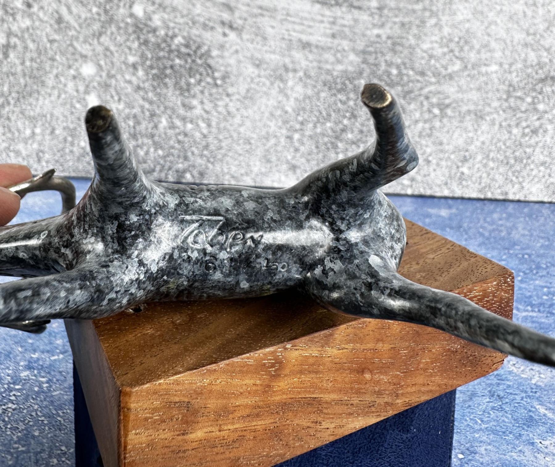6 1/2" by 6" by 3" on base. Gene Tobey (1945 - 2006) was active/lived in Texas, New Mexico. Gene Tobey is known for Ceramic mod animal sculpture. From Mason, Texas, Gene Tobey and his wife Rebecca have worked as a team, creating brightly colored, somewhat abstract animals with elements of realism and with line drawings incised into the surfaces. Their work ranges from small objects to a fifteen-foot bronze bear at the Law School of Baylor University. Tobey was born in Utah and began his career as a working potter and sculptor and teacher at Casper Community College in Casper, Wyoming. He was also a teacher in Albany, Oregon at Linn-Benton Community College. In 1985, he married Rebecca, and they combined five children into a family and started working together professionally. In the mid 1990s, they shifted away from ceramics to work in bronze and experiment with eye-catching patinas. Gene Tobey died at age 60 in Santa Fe, New Mexico of leukemia.