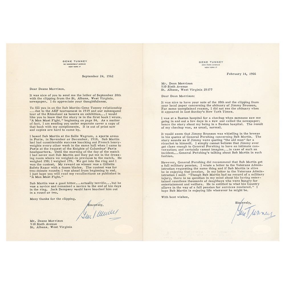 Two TLSs from Gene Tunney to Deane Morrison, both one page, personal letterhead, 7.25 x 10.5. The earlier letter, September 24, 1962, finds Tunney sending Morrison a copy of his book, A Man Must Fight, and talking about his match with boxer Bob Martin: “My reward as winner was a Gillette Safety Razor with a dozen blades.†The second letter, February 14, 1966, concerns a “usual, normal†visit to a Boston hospital, the death of manager Jimmy Bronson, and the relationship between Martin and General John J. Pershing: “General Pershing did recommend that Bob Martin get a full military pension. I wrote a letter to the Veterans Administration requesting the same thing.†In overall fine condition. Accompanied by the original mailing envelopes and by two certificates of authenticity from JSA.