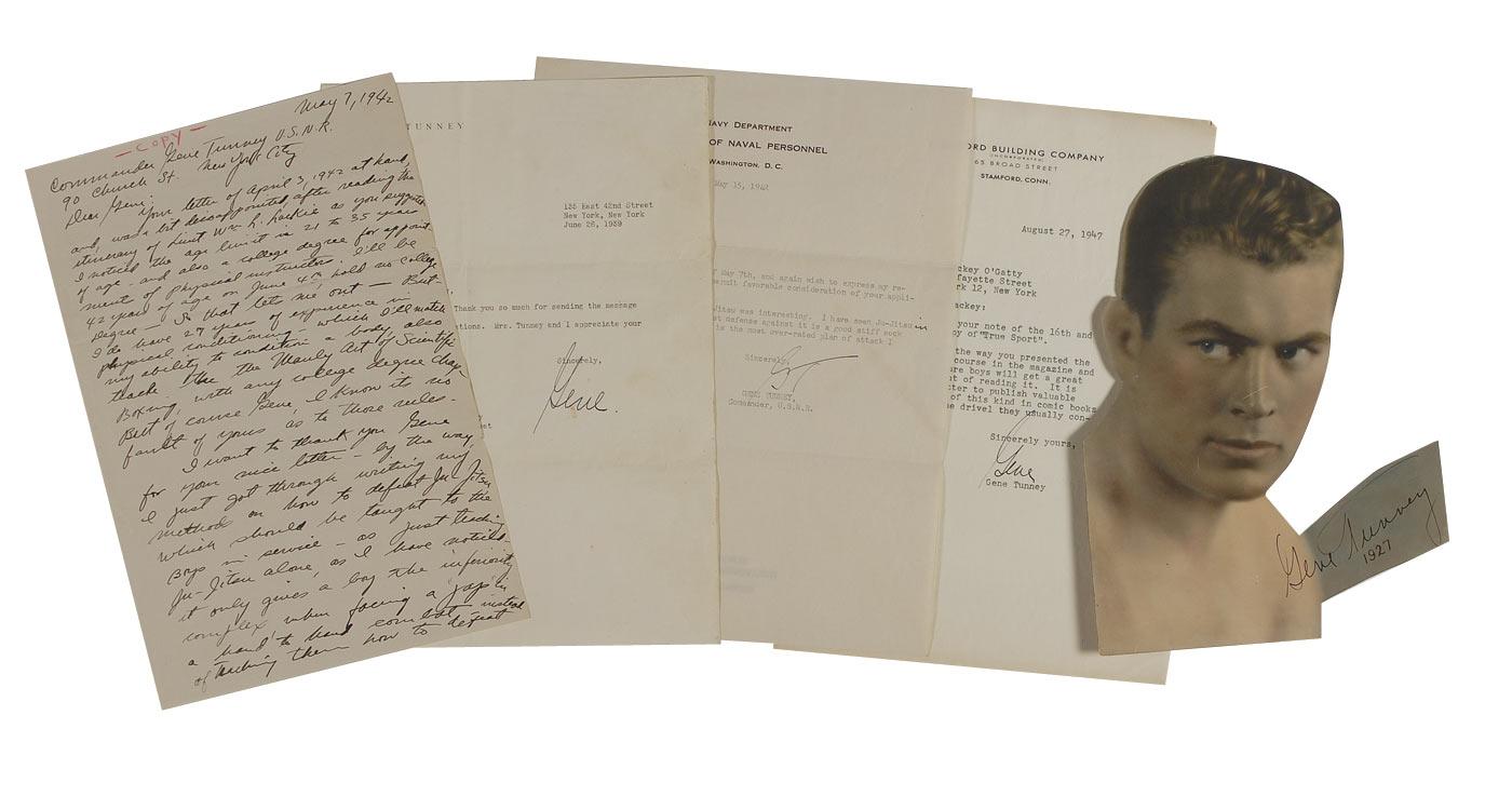 TLS signed “Gene,” one page, 7 x 10.5, August 27, 1947. Short letter to O’Gatty. In full, “I have your note of the 16th and the copy of ‘True Sport.’ I like the way you presented the boxing course in the magazine and I am sure the boys will get a great kick out of reading it. It is far better to publish valuable things of this kind in comic books than the drivel they usually contain.” Scattered toning, soiling and creasing, otherwise fine condition.