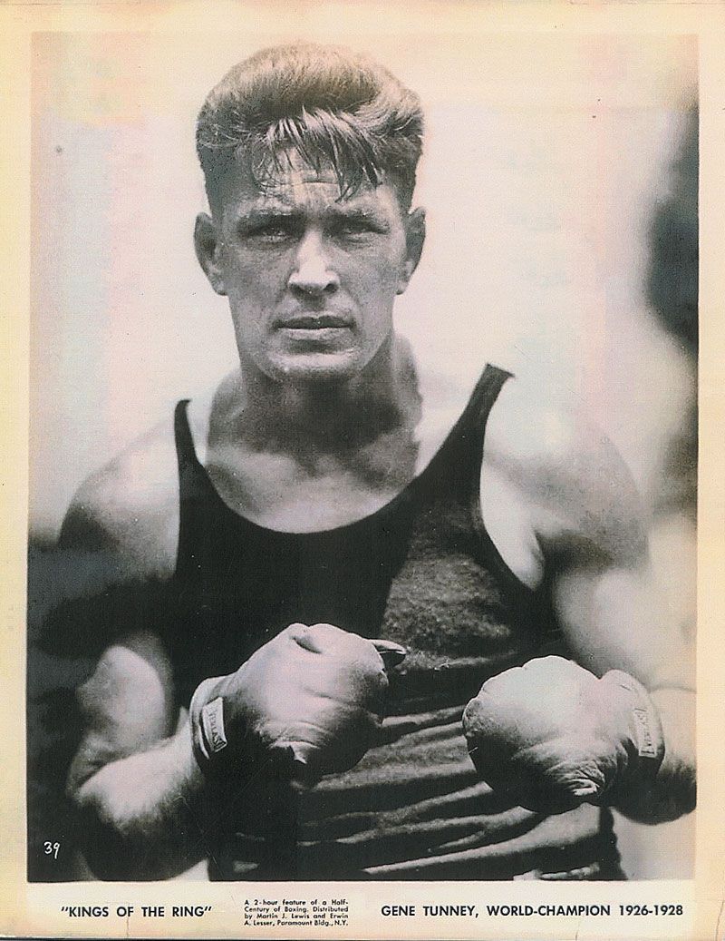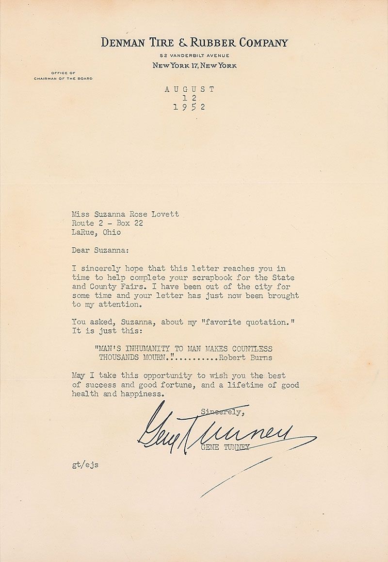 TLS, one page, 7.25 x 10.5, Denman Tire & Rubber Company letterhead, August 12, 1952. Letter to a young woman asking for his favorite quote. In part: “I sincerely hope that this letter reaches you in time to help complete your scrapbook for the State and County Fairs…my ‘favorite quotation.’ It is just this: ‘Man’s inhumanity to man makes countless thousands mourn.’…Robert Burns.” In fine condition, with some mild toning to edges. Accompanied by an unsigned 8 x 10 photo of Tunney from Kings of the Ring.