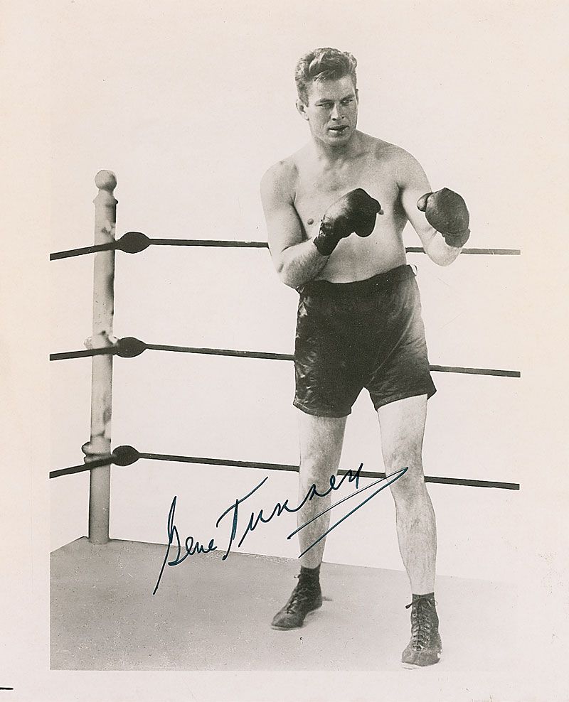 Glossy 8 x 10 photo of Tunney posing in the ring, signed in black felt tip. In fine condition.