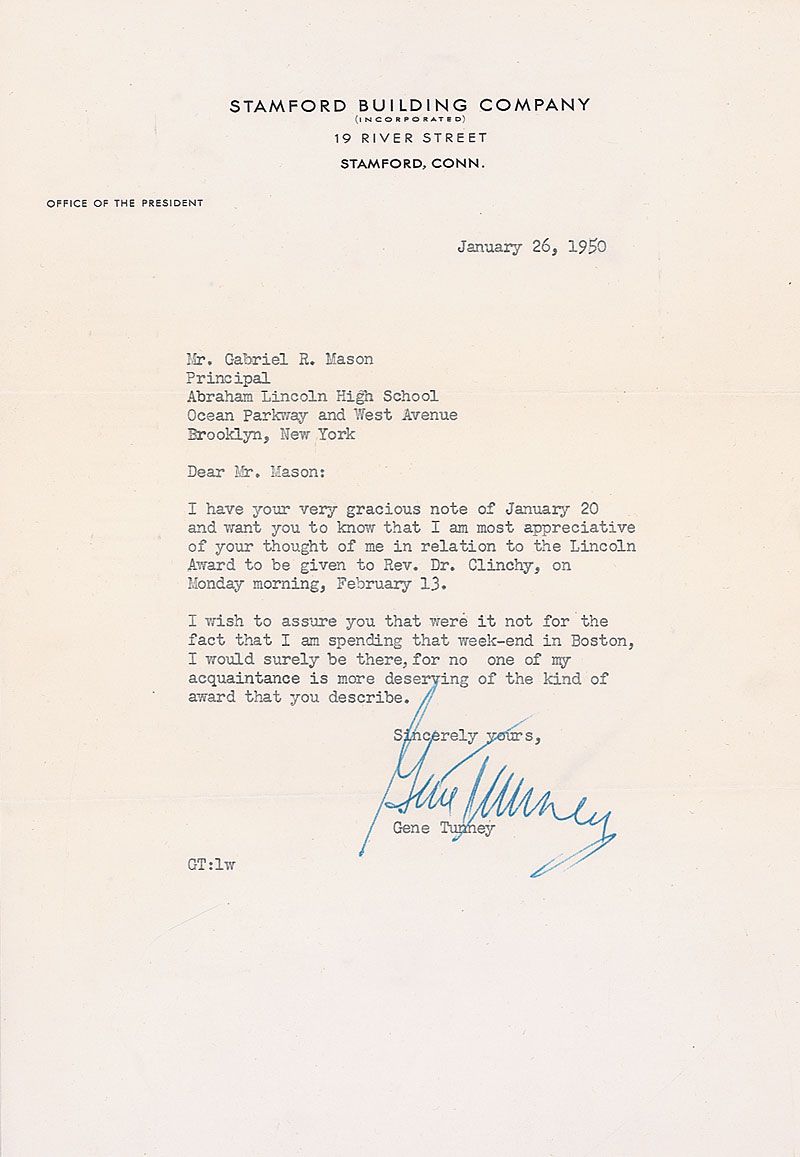 ALS, one page, 7.25 x 10.5, Stamford Building Company letterhead, January 26, 1950. Letter declining an invitation. In part: “I wish to assure you that were it not for the fact that I am spending that week-end in Boston, I would surely be there.” In fine condition, with the lower mailing fold passing through the signature.