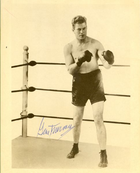 Vintage matte-finish 8 x 10 photo of Tunney posing in a boxing ring, signed in fountain pen. Some scattered light creasing, with a couple affecting last name of signature, otherwise fine condition.