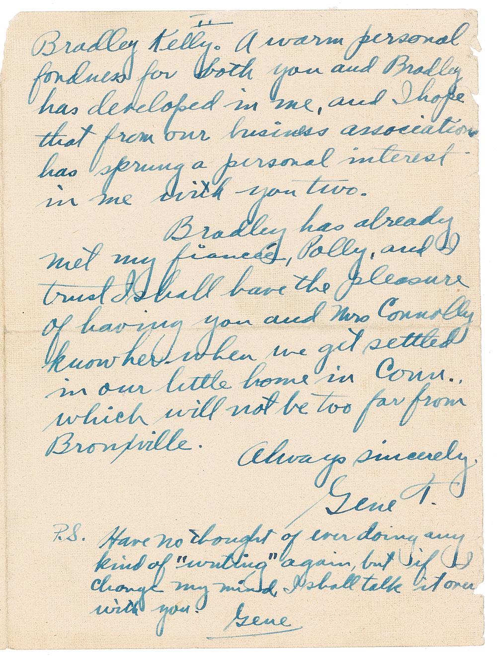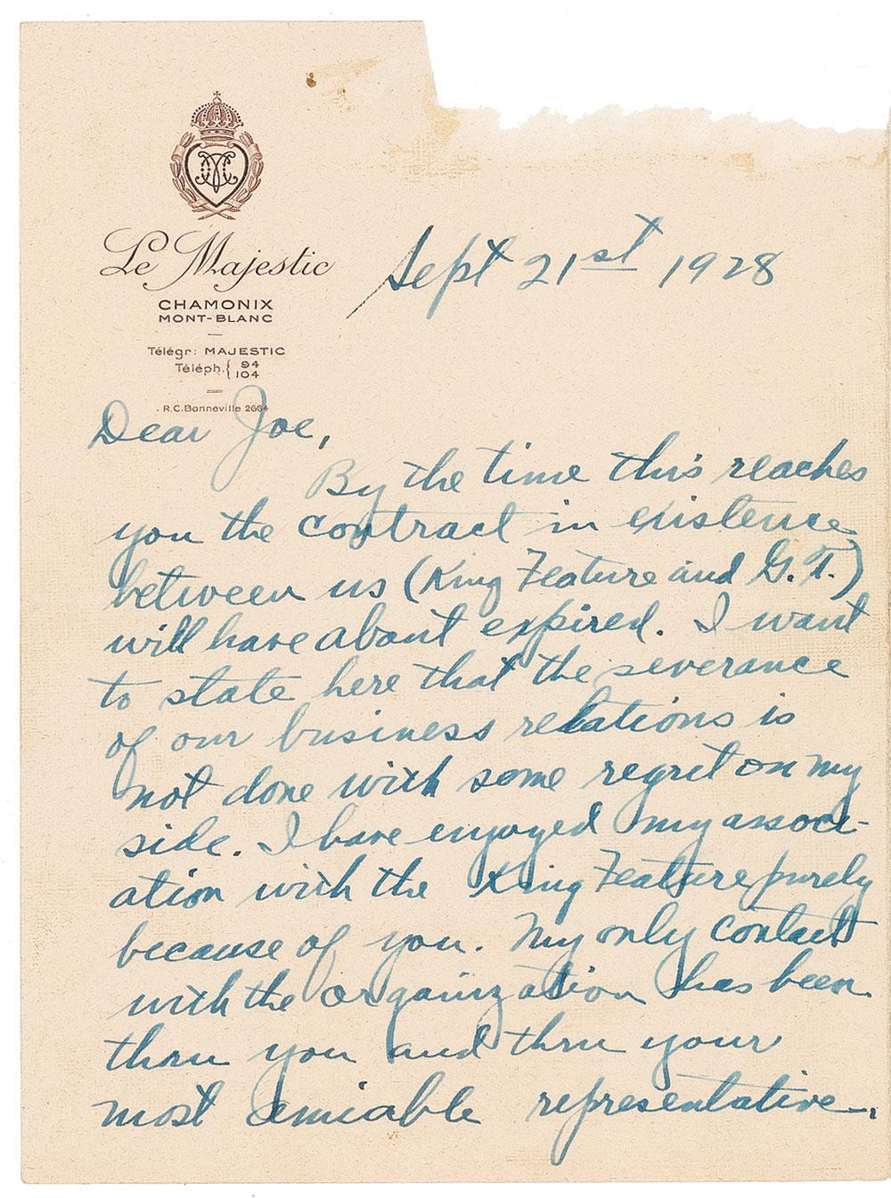 ALS signed “Gene T.,” two pages on two adjoining sheets, 5.5 x 7, Le Majestic letterhead, September 21, 1928. Letter to Joe Connolly of King Features. In full: “By the time this reaches you the contract in existence between us (King Feature and G.T.) will have about expired. I want to state here that the severance of our business relations is not done with some regret on my side. I have enjoyed my association with the King Feature purely because of you. My only contact with the organization has been thru you and thru your most amicable representative, Bradley Kelly. A warm personal fondness for both you and Bradley has developed in me, and I hope that from our business associations has sprung a personal interest in me with you two.