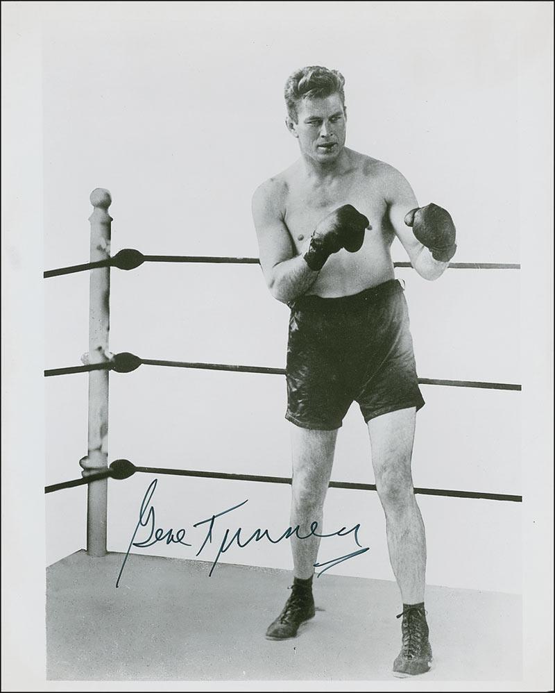 Glossy 8 x 10 full-length photo of Tunney in the ring, signed in black felt tip. In fine condition, with some scattered light bends and surface marks.