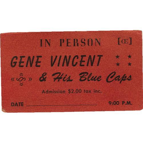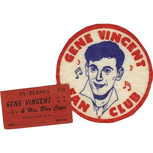 <B>Gene Vincent Concert Ticket and Fan Club Patch.</B></I> A 5" Gene Vincent Fan Club patch and an undated ticket to a performance by Vincent and the Blue Caps, both of which were previously displayed in the Rock and Roll Hall of Fame. Both are in Very Fine condition with some mild wear.<BR><BR><b>Shipping:</b> Flat Material, Small (<a target="_blank" href="http://www.heritageauctions.com/common/shipping.php">view shipping information</a>)