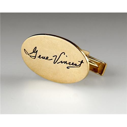 <B>Gene Vincent Engraved Gold Cuff Link.</B></I> A gold cuff link with Vincent's name engraved on it, owned and worn by the "Be-Bop-A-Lula" singer. Its mate has been missing ever since an overeager female fan ripped it -- and the sleeve it was attached to -- from Vincent's shirt during a performance! This survivor is in Excellent condition.<BR><BR><b>Shipping:</b> Miscellaneous Collectibles, Smal (<a target="_blank" href="http://www.heritageauctions.com/common/shipping.php">view shipping information</a>)