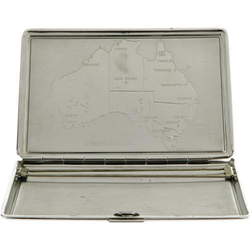 <B>Gene Vincent Owned Cigarette Case.</B></I> A stainless steel cigarette case with brown vinyl panels, owned and used by the late rocker. The case opens to reveal a map of Australia engraved inside the lid, and was purchased by him during a tour of the continent in 1957. In Excellent condition with minimal wear.<BR><BR><b>Shipping:</b> Miscellaneous Collectibles, Larg (<a target="_blank" href="http://www.heritageauctions.com/common/shipping.php">view shipping information</a>)