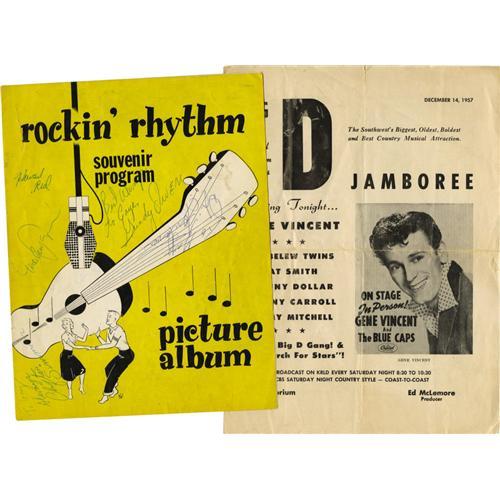 <B>Gene Vincent Programs, One Signed by Various Artists.</B></I> A pair of vintage programs for shows that featured Gene Vincent, one of which is signed on the front cover by D.J. Fontana, Howard Reed, Grady Owen, and others in blue ballpoint. Both are in Fine condition with moderate wear, tanning, and creasing.<BR><BR><b>Shipping:</b> Books & Catalogs (<a target="_blank" href="http://www.heritageauctions.com/common/shipping.php">view shipping information</a>)