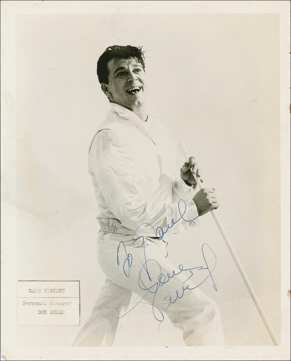 First generation Rock ’n’ Roller who achieved legendary status with songs such as ‘Be-Bop-A-Lula’ and ‘Lotta Lovin’’; he died in 1971 aged 36. Vintage glossy 8 x 10 photo, signed and inscribed in blue ink “To Paul, Gene Vincent.” In very good condition, with scattered creases and surface marks, mild curling to horizontal edges, and some light staining to right edge.