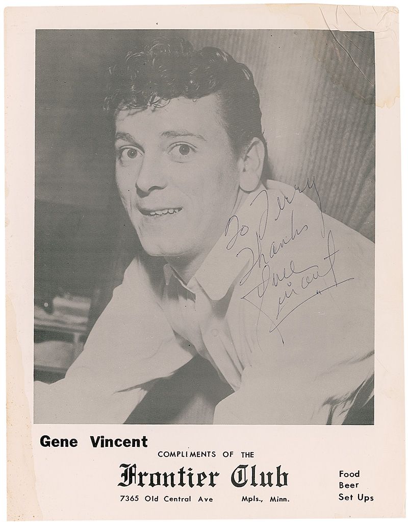First generation Rock ’n’ Roller who achieved legendary status with songs such as ‘Be-Bop-A-Lula’ and ‘Lotta Lovin’; he died in 1971 aged 36. Scarce vintage 8.25 x 11 cardstock publicity photo for Vincent at the Frontier Club in Minneapolis, signed and inscribed in blue ballpoint “To Terry, Thanks, Gene Vincent.” In very good condition, with moderate creasing and dampstaining to top right, some lighter staining to lower left, and a few other edge dings. Consignor notes signature was acquired in the late 1960s at the Frontier Club.