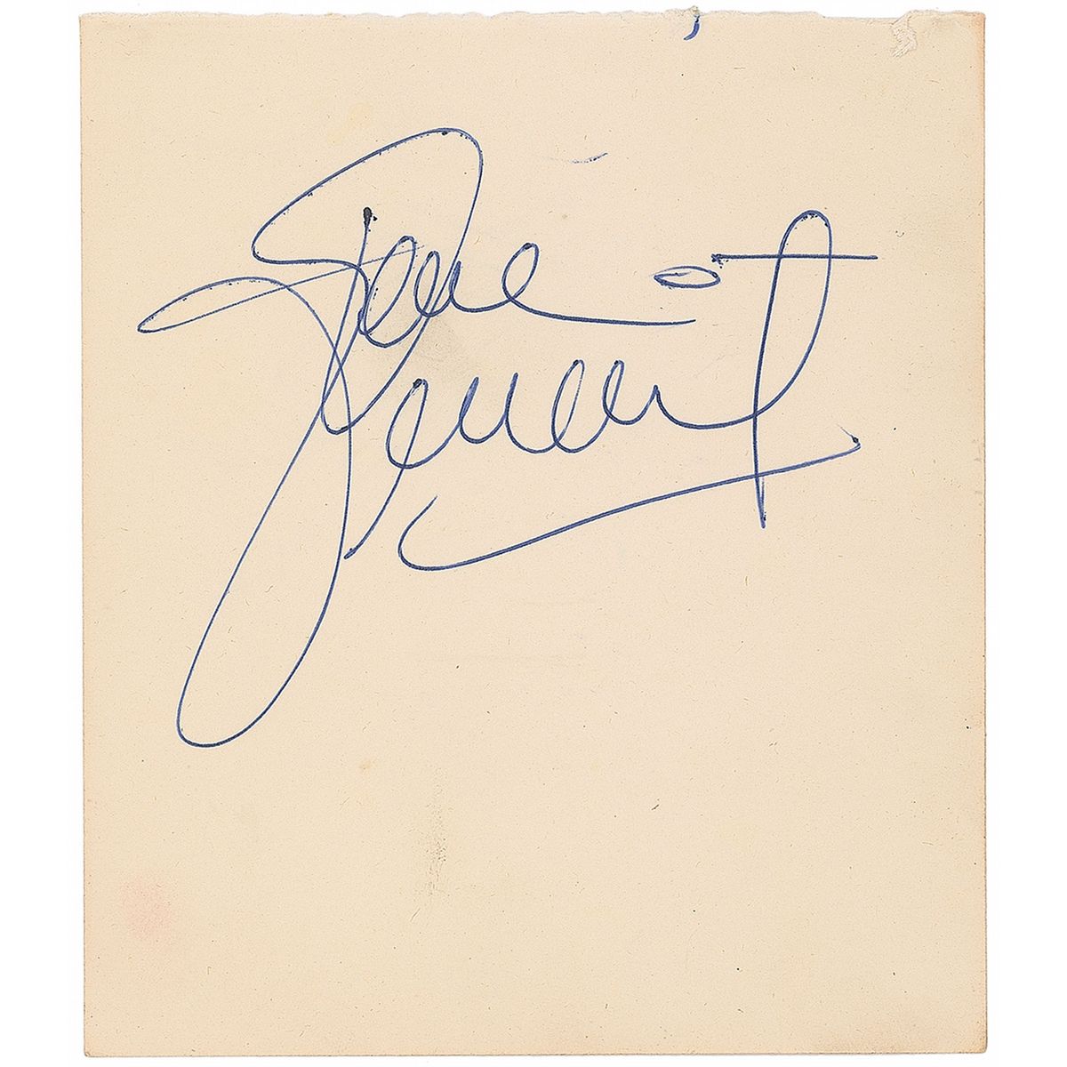 Rock and roll and rockabilly pioneer (1935–1976) who achieved legendary status with songs such as ‘Be-Bop-A-Lula’ and ‘Lotta Lovin.’ Ballpoint signature, “Gene Vincent,” on an off-white 4 x 4.5 album page. In fine condition. Accompanied by a certificate of authenticity from Tracks.