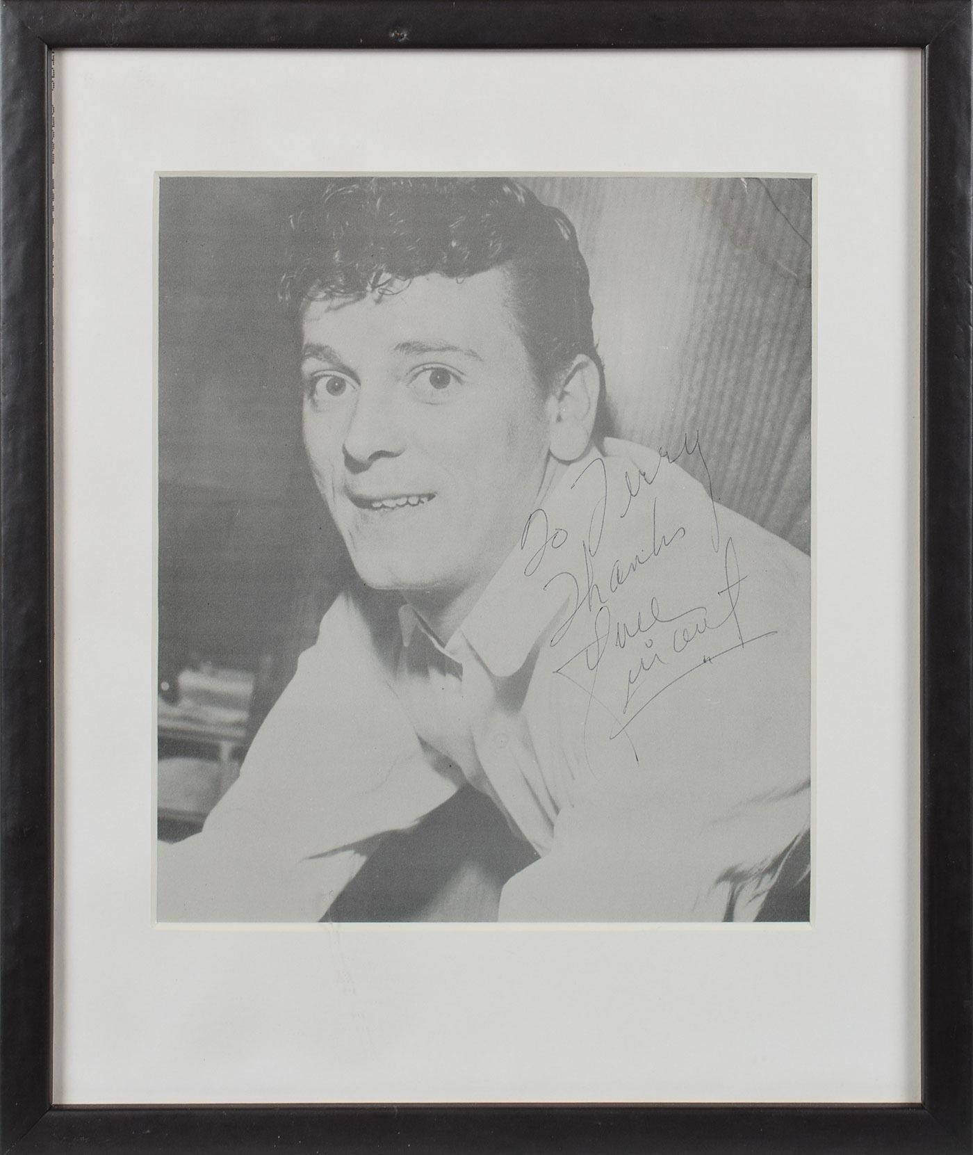 Vintage 7 x 8 cardstock publicity photo of the early rock and roll star, signed and inscribed in black ballpoint, "To Terry, Thanks, Gene Vincent.” Matted and framed to an overall size of 10.5 x 12.5. In fine condition, with some damage to the upper right corner area. Accompanied by a full letter of authenticity from PSA/DNA.