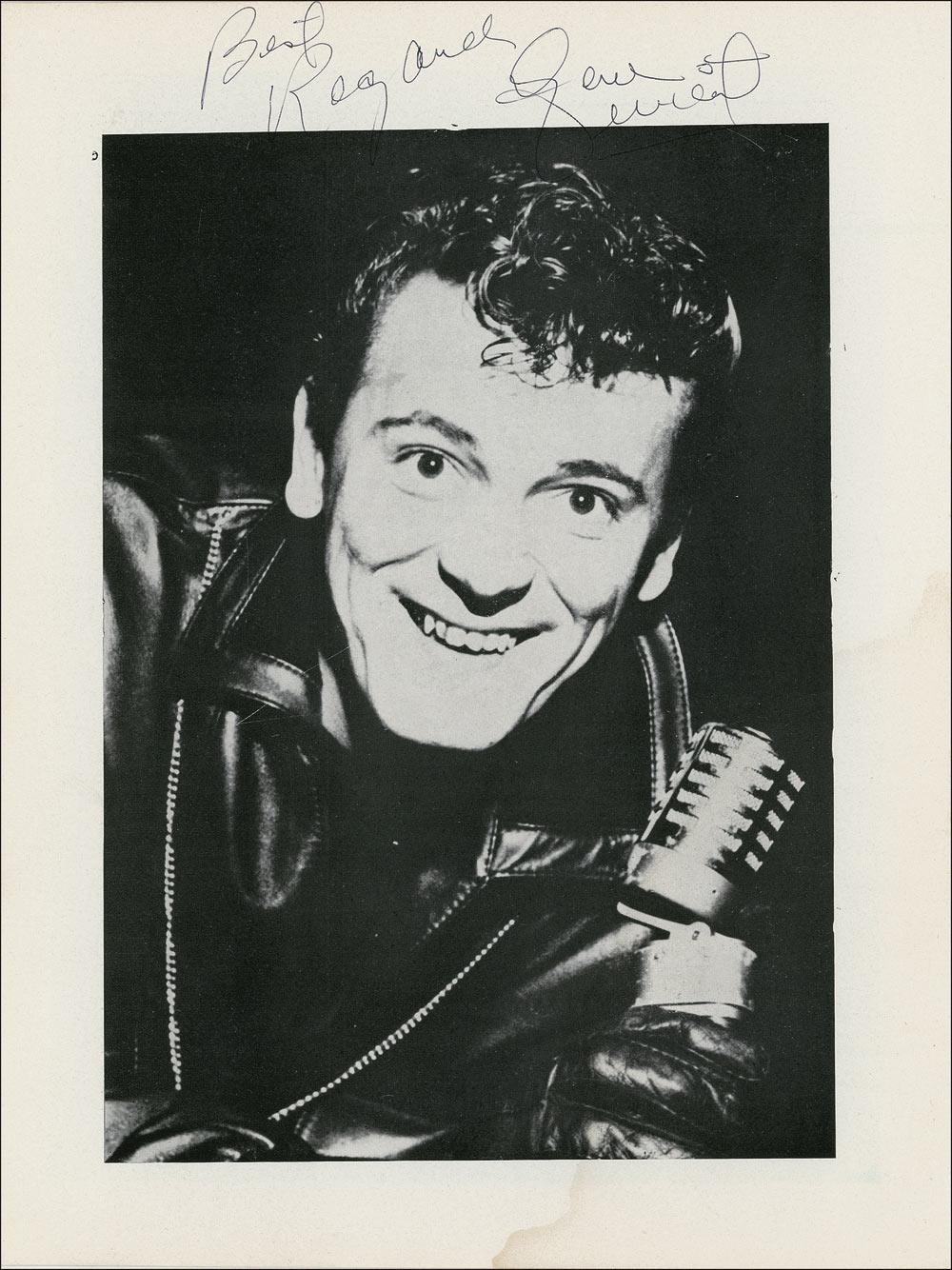 First generation Rock ’n’ Roller who achieved legendary status with songs such as ‘Be-Bop-A-Lula’ and ‘Lotta Lovin’’; he died in 1971 aged 36. Vintage 8 x 10.5 tour book photo, signed in the top border in black ink, “Best regards, Gene Vincent.” Integral second page contains biographies on Duane Eddy and The Shirelles. Light rippling and damp staining to lower portion of image, otherwise fine condition. Research indicates Vincent joined Eddy and the Shirelles on a 1963 British tour. Vincent is quite uncommon in signed photos.