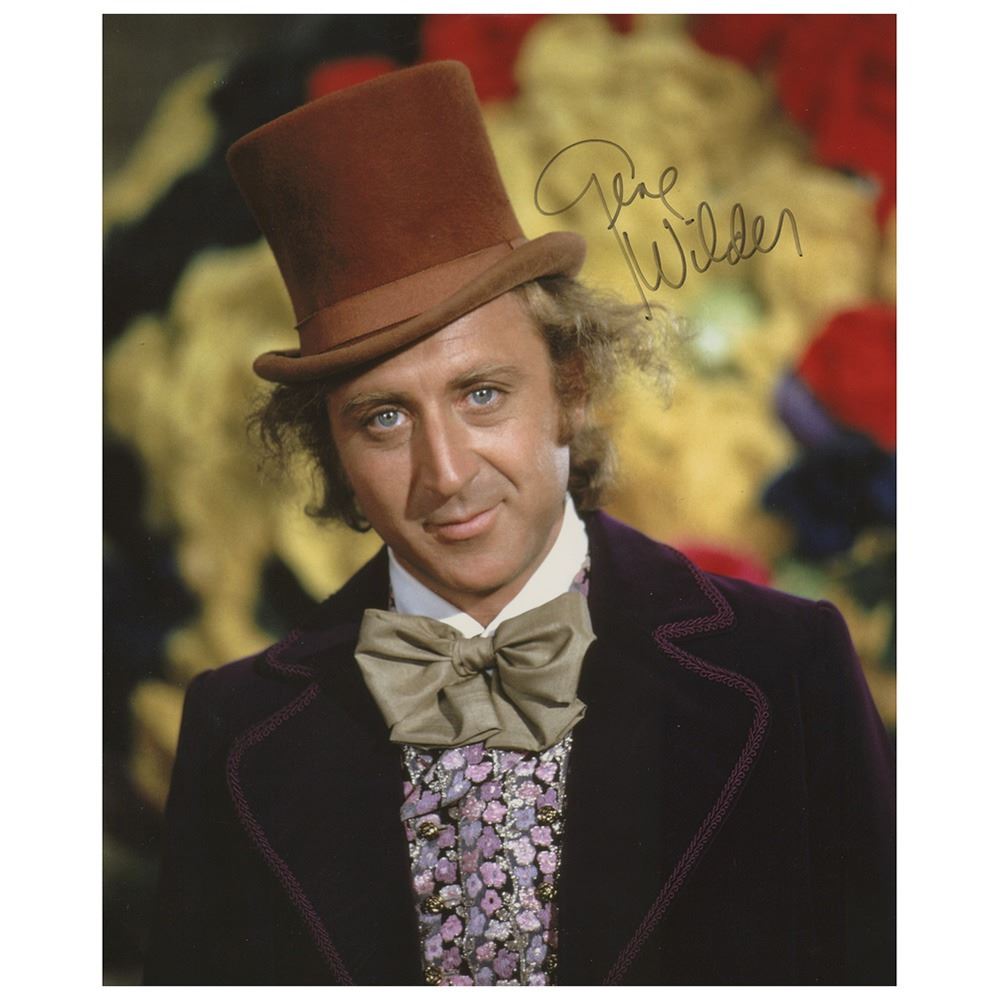 Color satin-finish 8 x 10 photo of Gene Wilder in his memorable turn as the title character from the 1971 film Willy Wonka & the Chocolate Factory, signed in black felt tip. In fine condition, with a couple of small surface creases.