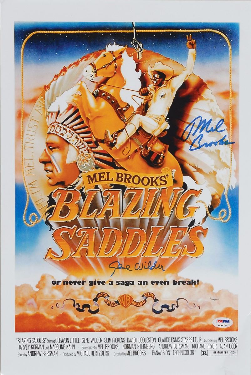 Color satin-finish 12 x 18 photo of the poster for the 1974 comedy Blazing Saddles, signed in blue felt tip by Gene Wilder and Mel Brooks. In fine condition, with a crease to lower right corner. Accompanied by a certificate of authenticity from PSA/DNA.