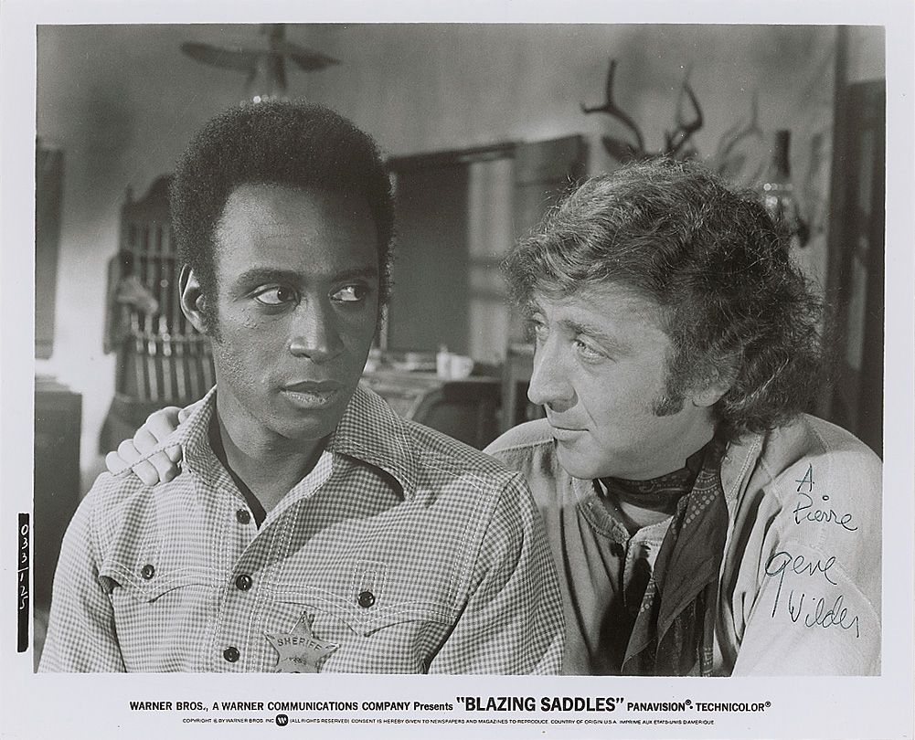 Glossy 10 x 8 Warner Bros. promotional photo for Blazing Saddles, signed and inscribed in-person in black felt tip “A Pierre, Gene Wilder.” In fine condition, with some spotting to the finish and slight irregular adhesion to the inscription and signature.