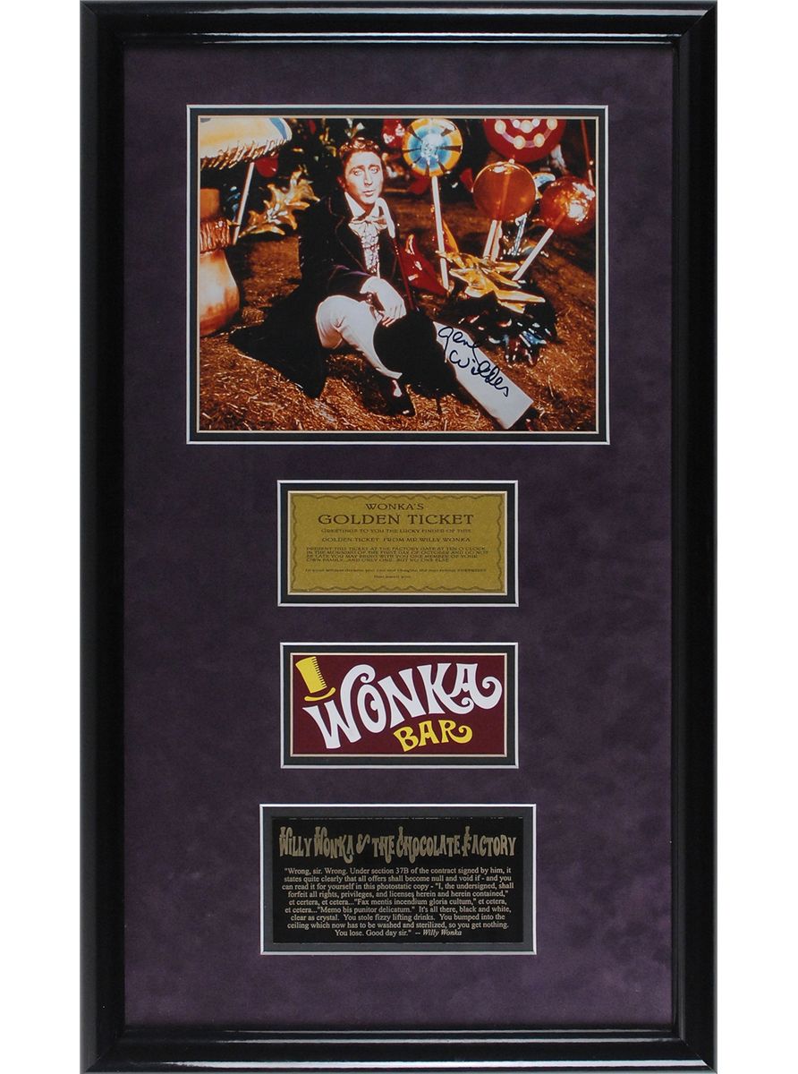 Color glossy 10 x 8 photo, signed in black felt tip. Double-suede-matted and framed with images of a Wonka golden ticket and Wonka Bar wrapper as well as an engraved quote from the conclusion of the film to an overall size of 15.5 x 26. In very fine condition. Oversized.