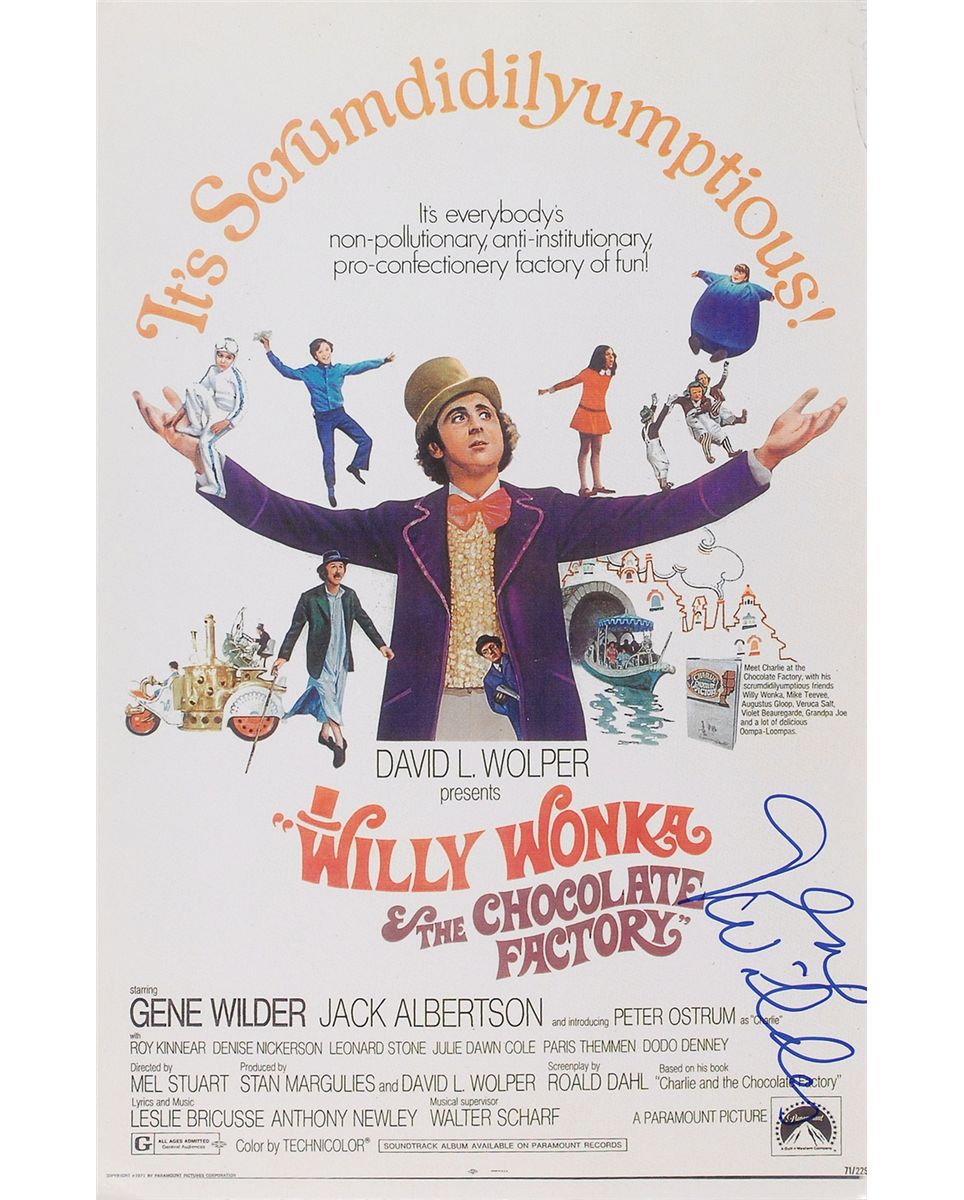 Color 11 x 17 mini-poster for Willie Wonka and the Chocolate Factory, signed in person in blue felt tip. Some creases and slight surface loss to top right, otherwise fine condition. Originally obtained by in-person specialist Mike Wehrmann.