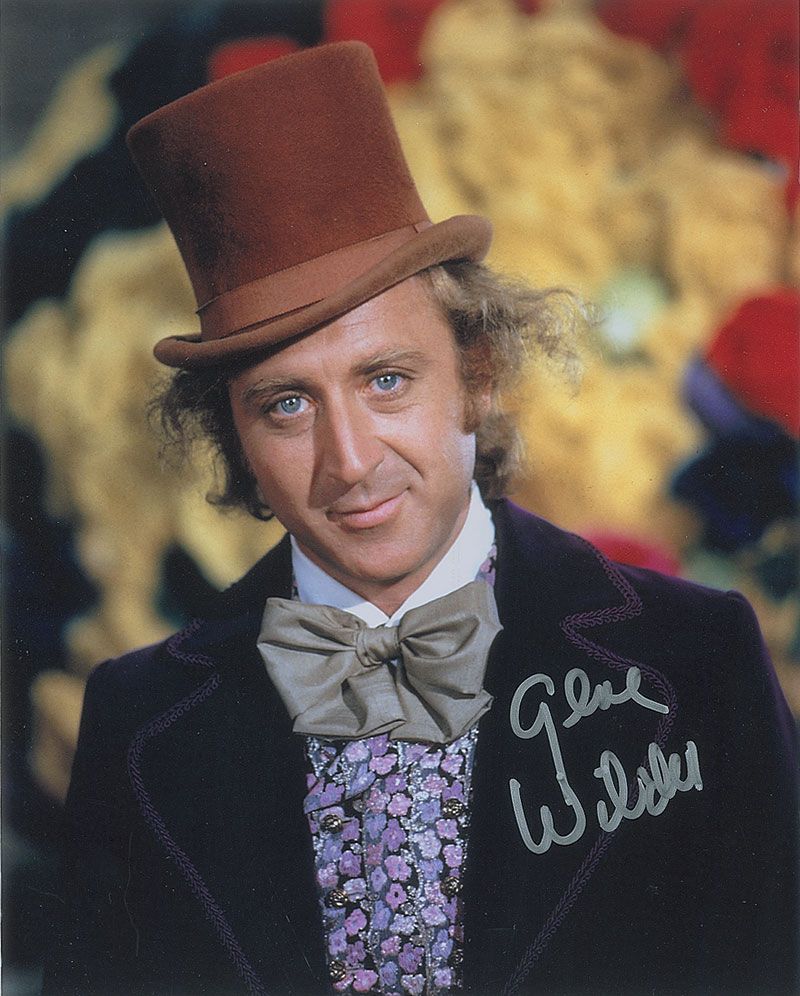 Color satin-finish 8 x 10 photo of Wilder as Willy Wonka, signed in silver ink. In fine condition.