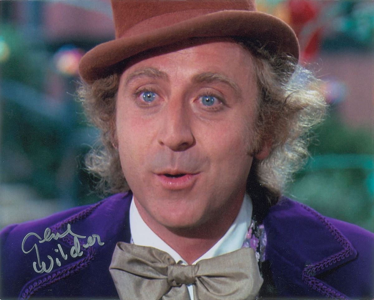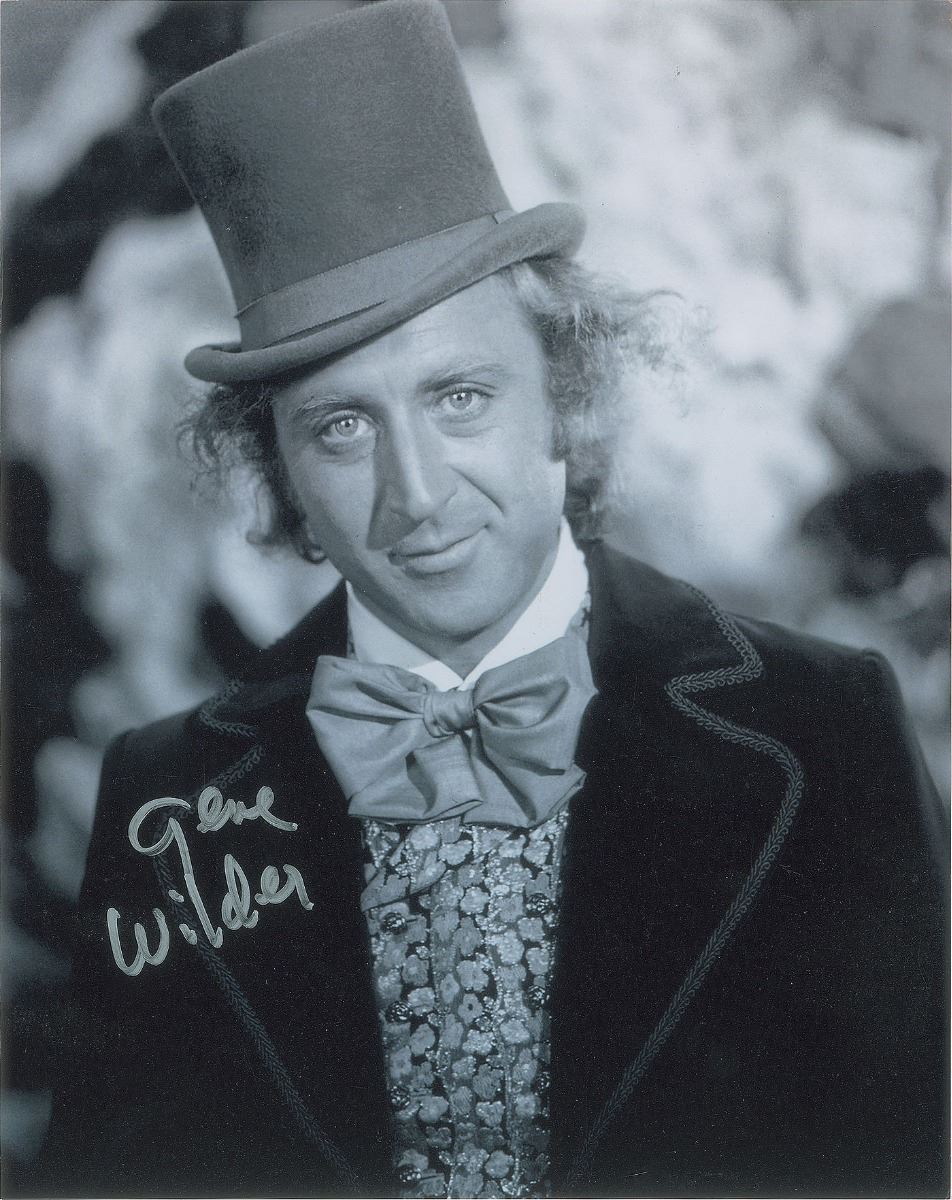 Two satin-finish photos of Wilder as Willy Wonka, 8 x 10 and 10 x 8, both signed in silver ink. In overall fine condition.