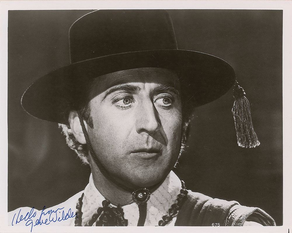 Glossy 8 x 10 close-up photo of Wilder as Rudy Hickman/Rudy Valentine from the 1977 film The World's Greatest Lover, signed in blue felt tip, "Hello from Gene Wilder." In fine condition.