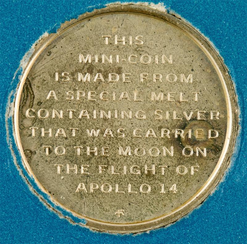 Dated August 28, 1971. “The Limited Edition Mini-Coin… was made from a special melt of silver into which was placed 10,000 grains of silver that was carried aboard Apollo 14 on its voyage around the moon.” Presented to members of The Franklin Mint Collectors Society, with accompanying certificate of authenticity. 12 mm.