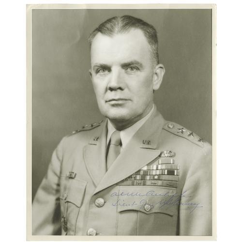 <B> General Anthony McAuliffe Signed Photograph. </B></I> 8" x 9.75" black and white photograph of McAuliffe wearing his full uniform and all his decorations. He signs himself, <I> "A.C. McAuliffe, Lieut. Gen., US Army." </B></I> McAuliffe was a general during WWII, and was famous for his one word reply to a German surrender ultimatum. McAuliffe and his men were surrounded by Germans, and when the German commander, General Heinrich von Luettwitz demanded his surrender, McAuliffe sent his famous reply, "Nuts!" <r The photograph is in very fine condition; writing has slightly faded. From the Henry E. Luhrs Collection. Accompanied by LOA from PSA/DNA.
