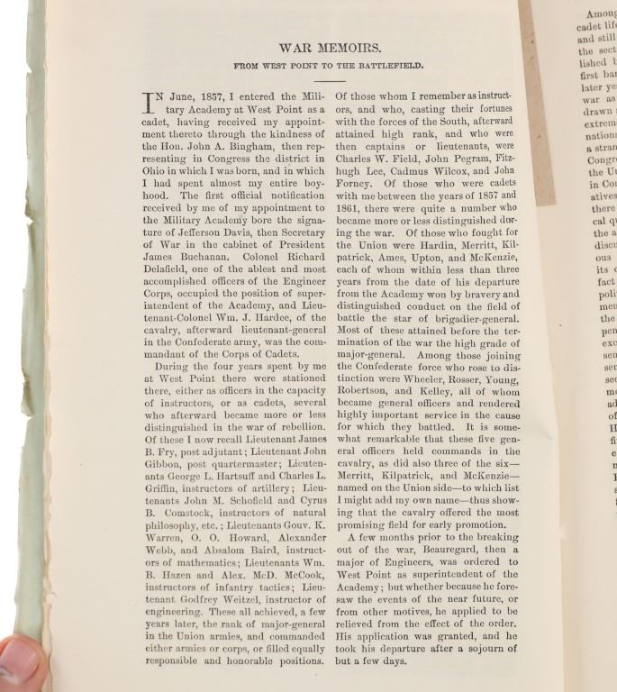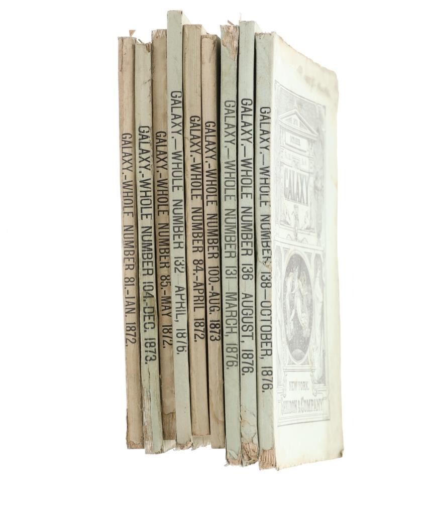 Offered in this lot are the Scarce and Rare Nine First Edition Issues of The Galaxy Magazine from 1872, 1873, and 1876, publisher Sheldon & Company, New York, with content from General Armstrong Custer including the first printing of what would become his book, "My Life on the Plains" originally published serially in the Galaxy magazine starting in 1872. Issues include: Jan. 1872 - Vol. 13, No. 1, April & May 1872; Aug. & Dec. 1873; and, March, April, Aug. and October 1876. Galaxy Magazine, or, "The Galaxy: An Illustrated Monthly" was an American monthly magazine from 1868 until it was eventually absorbed by The Atlantic Monthly in 1878. Notable contributors to the magazine include Mark Twain, Walt Whitman, Ion Hanford Perdicaris and Henry James. In 2021, a first edition of "My Life on the Plains" sold for $3,000.00, and in the 2023 summer another first edition sold for $1,500.00. Magazines are in amazingly preserved condition. First four have cream colored covers, the remainder have pale green colored covers. Covers have a variety of edge tatters though spine printing is intact. Last four have deckled pages, some moisture staining noted as well as both age tanning and foxing. First five each measure 9.25"L x 6.25"W, last four each are 10"L x 6.25"W, combined weight is 4lb 6oz.*