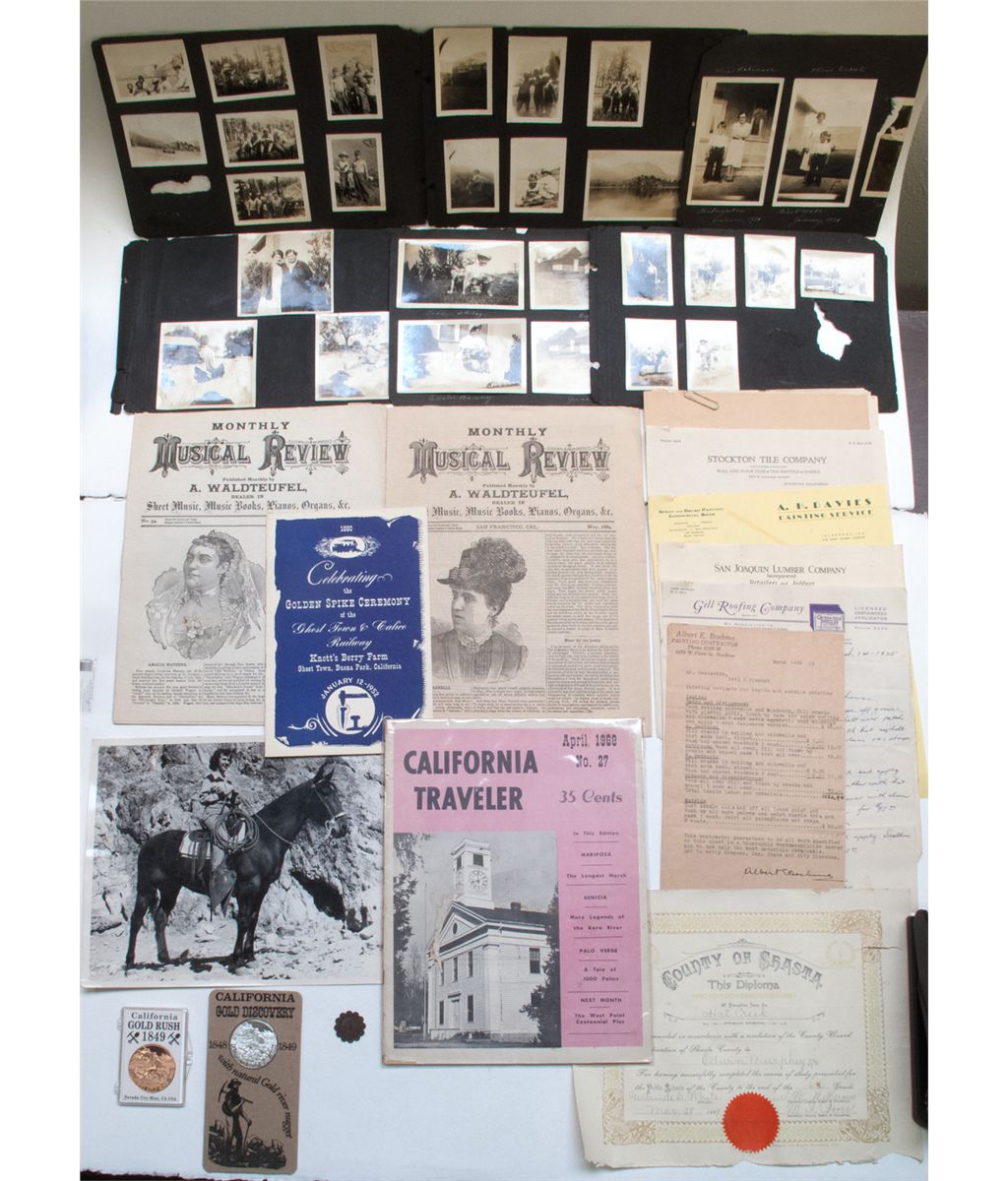 Lot of approximately 20 pieces. Included are: a Hat Creek Public School diploma, 1899; an 1884 Monthly Musical Review publication with sheet music; letters from the 1930s; 29 snapshots of June Lake on multiple album pages; an April 1968 issue of the California Traveler; photo of a woman on horseback, c1950s; a 1952 brochure commemorating the Golden Spike Ceremony at Knottās Berry Farm; a maverick token Good For 1 Drink; and 2 commemorative California Gold Rush Discovery coins. County: Mono State: CA