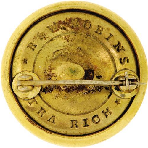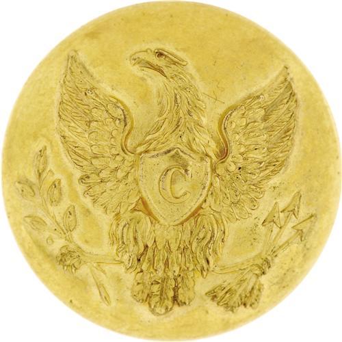 <B>Cavalry Button From General George Armstrong Custer's Uniform As Saved By His Family</B></I> 23 mm, heavily gilt two-piece brass construction, the face is dominated by a Federal eagle with spread wings holding an olive branch and arrows in its talons, a shield emblazoned with a large “C” (for “Cavalry”) is centered on the eagle's chest, the button's underside carries the R & W Robinson Extra Rich depressed backmark (Tice 28). The shank has been removed with a hinged attachment pin affixed in its place so that the button can function as a brooch. The holes resulting from the shank's removal have been filled with solder that matches the brass of the button back. In pristine condition.<BR><BR> A 5” x 3” typed note gives the button's provenance as follows: “Cavalry Buttons From The Uniform of General George Armstrong Custer. 3- 23 - 57. From Miriam Custer.” Miss Miriam Custer was sired by Nevin Custer, one of General Custer's brothers. As such, the famous cavalryman was her great-uncle. A seemingly unrelated signature, “<I>. Frost</B></I>”, is inscribed over the date on the note. This would have been penned by Dr. Lawrence Frost, noted Michigan expert on Custer and a collector of related material. No doubt the button temporarily resided in his esteemed collection with Custer's wife Libbie wearing his buttons often.<BR><BR><b>Shipping:</b> Flat Material, Small (<a target="_blank" href="http://www.heritageauctions.com/common/shipping.php">view shipping information</a>)