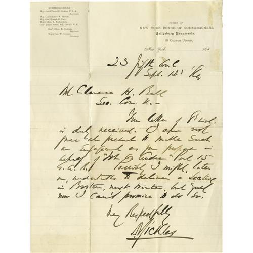 <B>General Daniel Sickles Autograph Letter Signed as Chairman of the New York Board of Commissioners, Gettysburg Monuments</B></I> on imprinted letterhead, 1 page, 8" x 10.5", New York, Sep. 12, 1886, to a Mr. Clarence Bell declining an invitation to speak stating he "<I>...might later on undertake to deliver a lecture in Boston, next winter.</B></I>" Usual mail folds, with minor separations thereat, and two small mounting remnants at top right, otherwise bold ink and very good condition.<BR><BR><b>Shipping:</b> Flat Material, Small (<a target="_blank" href="http://www.heritageauctions.com/common/shipping.php">view shipping information</a>) <BR><BR><B>Important notic