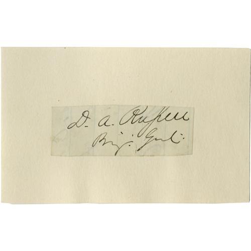 <B>General David Alan Russell Signature.</B></I> Russell signs this 4" x 2.5" card as "<I>D.A. Russell Brig. Genl.</B></I>" Russell was a decorated and respected General for the Union Army, he was killed at the battle of Winchester in 1864 by a cannonball. <BR><BR>The signature is in very fine condition; it has been laid down on the card, the signature is on a very small piece of white lined paper. From the Henry E. Luhrs Collection.
