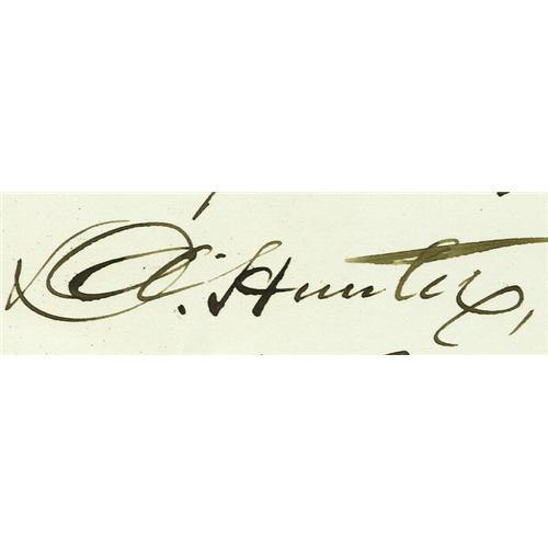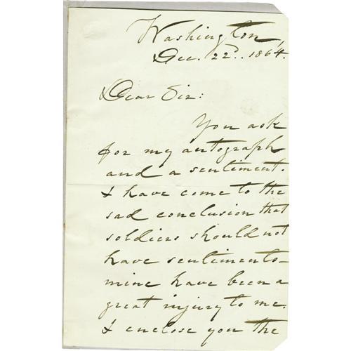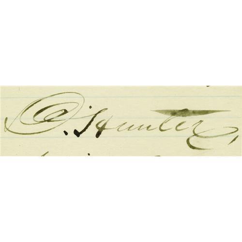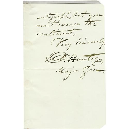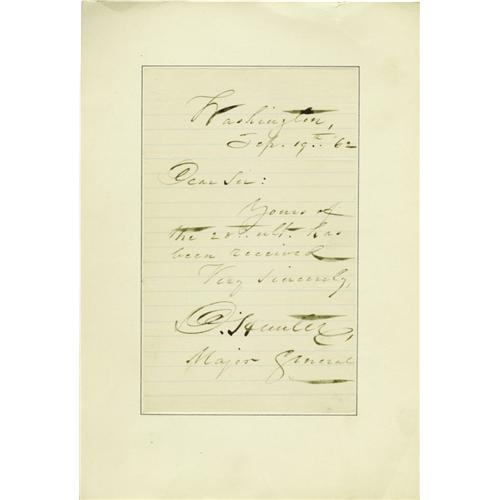 <B>General David Hunter. Two Civil War-date Autograph Letters Signed.</B></I> Comprises: <B>(1)</B></I> ALS: "<I>D. Hunter/Major General</B></I>", one page, 4.75" x 7.5". Washington, September 19, 1862. "<I>Yours of the 28th ult. has been received.</B></I>" Tipped at left to larger page. <B>(2)</B></I> ALS: "<I>D. Hunter/Major Gen</B></I>", two pages, 4.75" x 7.5", separate conjoined pages. Washington, December 22, 1864. "<I>You ask for my autograph and a sentiment. I have come to the conclusion that soldiers should not have sentiments - mine have been a great injury to me. I enclose you the autograph but you must excuse the sentiment.</B></I>" Tipped at left to larger page upon which has been affixed the trimmed address panel. Two blank corners of the letter have been diagonally cut off.<BR><BR>On May 9, 1862, as Commander of the Department of the South, General Hunter's sentiment caused him to free all slaves in South Carolina, Georgia and Florida. On May 19th, President Lincoln annulled Hunter's order, stating that he had exceeded his official authority and that such decisions were to be made only by the President. Hunter later organized the first regiment of black troops and was declared a felon by the Confederacy. After Lincoln's death, Hunter accompanied the President's body on its train journey to Springfield, Illinois, and later presided over the military commission that tried the conspirators for the assassination. With an engraved portrait of Hunter. Three items.<BR><BR><b>Shipping:</b> Small Flat (<a target="_blank" href="http://www.heritageauctions.com/common/shipping.php">view shipping information</a>)