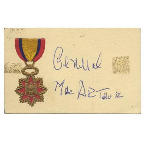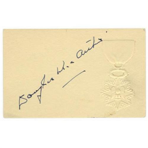 <B>General Douglas MacArthur Signature</B></I> “<I>Douglas MacArthur</B></I>”. 4” x 2.5”, signed on the reverse side of a table place card, remnants of glue remain on the front from having been mounted in an album, else a fine, bright signature in fine condition. Douglas MacArthur (1880-1864) played a prominent role in the U.S. victory in the Pacific during WWII. After the war he was instrumental in revitalizing post-war Japan and laying the foundation for Japan's miraculous economic recovery. <BR><BR><b>Shipping:</b> Flat Material, Small (<a target="_blank" href="http://www.heritageauctions.com/common/shipping.php">view shipping information</a>)