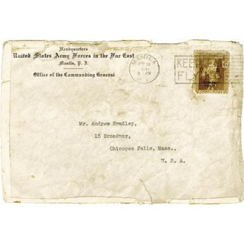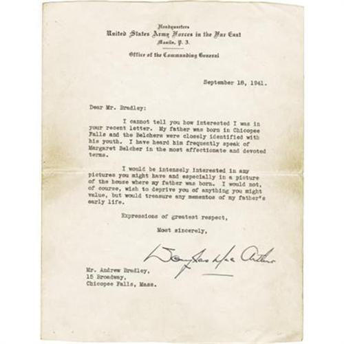 <B>Douglas MacArthur Typed Letter Signed</B></I> “<I>Douglas MacArthur,</B></I>” one page, 6.5” x 8.5”. Manila, September 18, 1941. To Andrew Bradley, Chicopee Falls, Mass. In part, “<I>My father was born in Chicopee Falls…I would be intensely interested in any pictures you might have and especially in a picture of the house where my father was born. I would not, of course, wish to deprive you of anything you might value, but would treasure any mementos of my father's early life.</B></I>” Born in Chicopee Falls, Massachusetts, Arthur MacArthur (1845-1912) was awarded the Congressional Medal of Honor during the Civil War for his performance at Missionary Ridge and was brevetted colonel in the Army at the age of 19. In the Spanish-American War, he was appointed Brigadier General in the volunteer army and commanded the Third Philippine Expedition. When he arrived in the Philippines, he led the 1st Brigade, 2nd Division, VIII Corps at the Battle of Manila (1898). He was appointed Major General of volunteers when the war ended. In July 1941, Major General Arthur MacArthur's son Douglas was named Commanding General of U. S. Army Forces in the Far East by President Franklin D. Roosevelt with headquarters in Manila, Philippine Islands. With original envelope, heavily soiled with tears at the edges. The letter is soiled at the left and right blank margins. The top and bottom edges have been slightly trimmed. Fine condition. <BR><BR><b>Shipping:</b> Flat Material, Small (<a target="_blank" href="http://www.heritageauctions.com/common/shipping.php">view shipping information</a>)