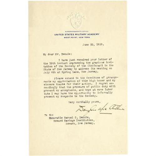 <B>General Douglas MacArthur Typed Letter Signed</B></I> 5.5” x 8.5”, one page, on Superintendent United States Military Academy stationary, June 20, 1919, West Point, New York. Fine <I>From the collection of Henry E. Luhrs.</B></I><I>.</B></I><BR><BR><BR><BR><b>Shipping:</b> Flat Material, Small (<a target="_blank" href="http://www.heritageauctions.com/common/shipping.php">view shipping information</a>)