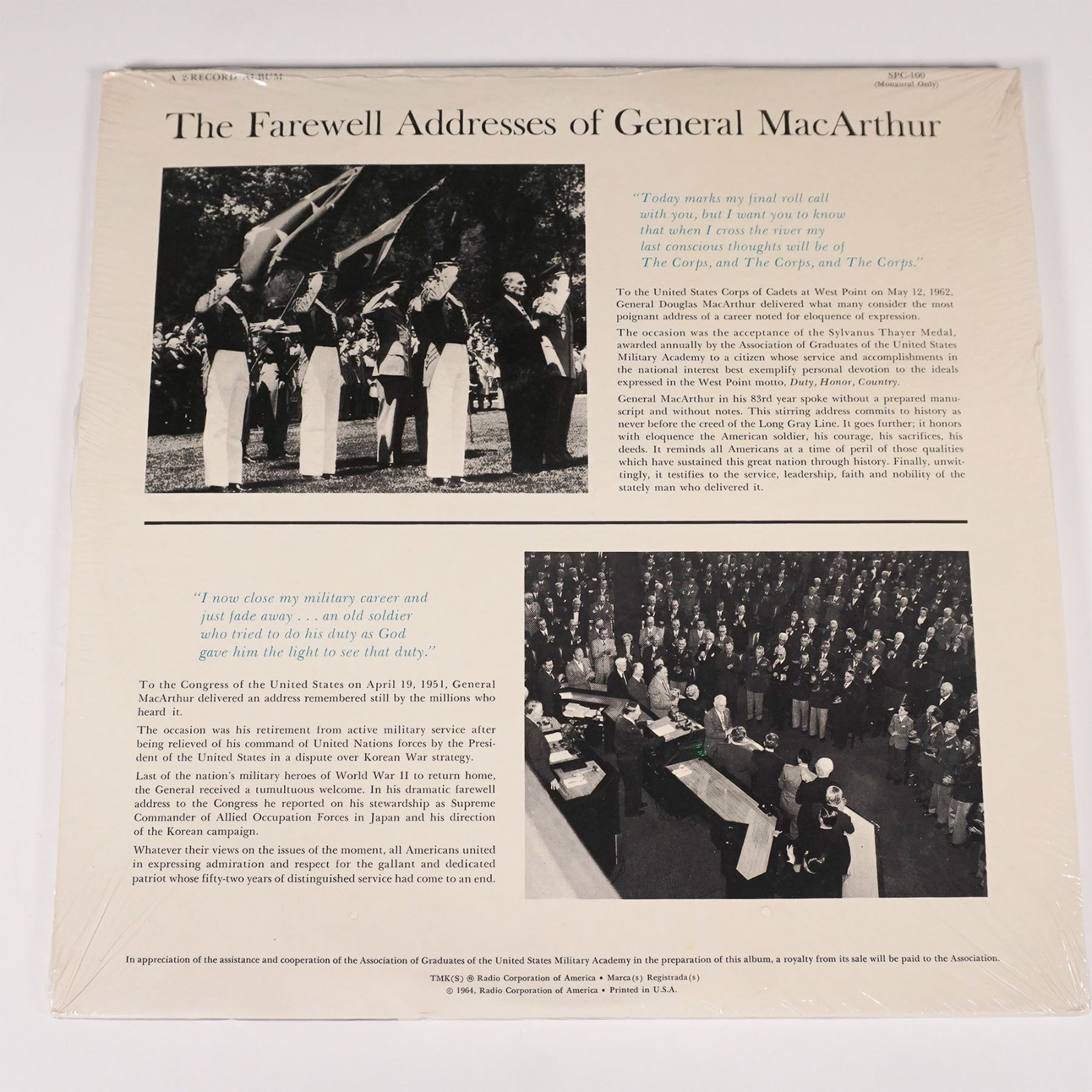 Sealed, historical RCA Camden vinyl LP set featuring 'The Farewell Addresses of General Douglas MacArthur'. This collection preserves two of MacArthur's most significant speeches: his address to the U.S. Congress on April 19, 1951, and his legendary Duty, Honor, Country speech delivered at West Point on May 12, 1962. These recordings capture the eloquence and enduring legacy of one of America's most celebrated military leaders. A valuable addition for collectors of historical speeches, military history, and spoken-word recordings.