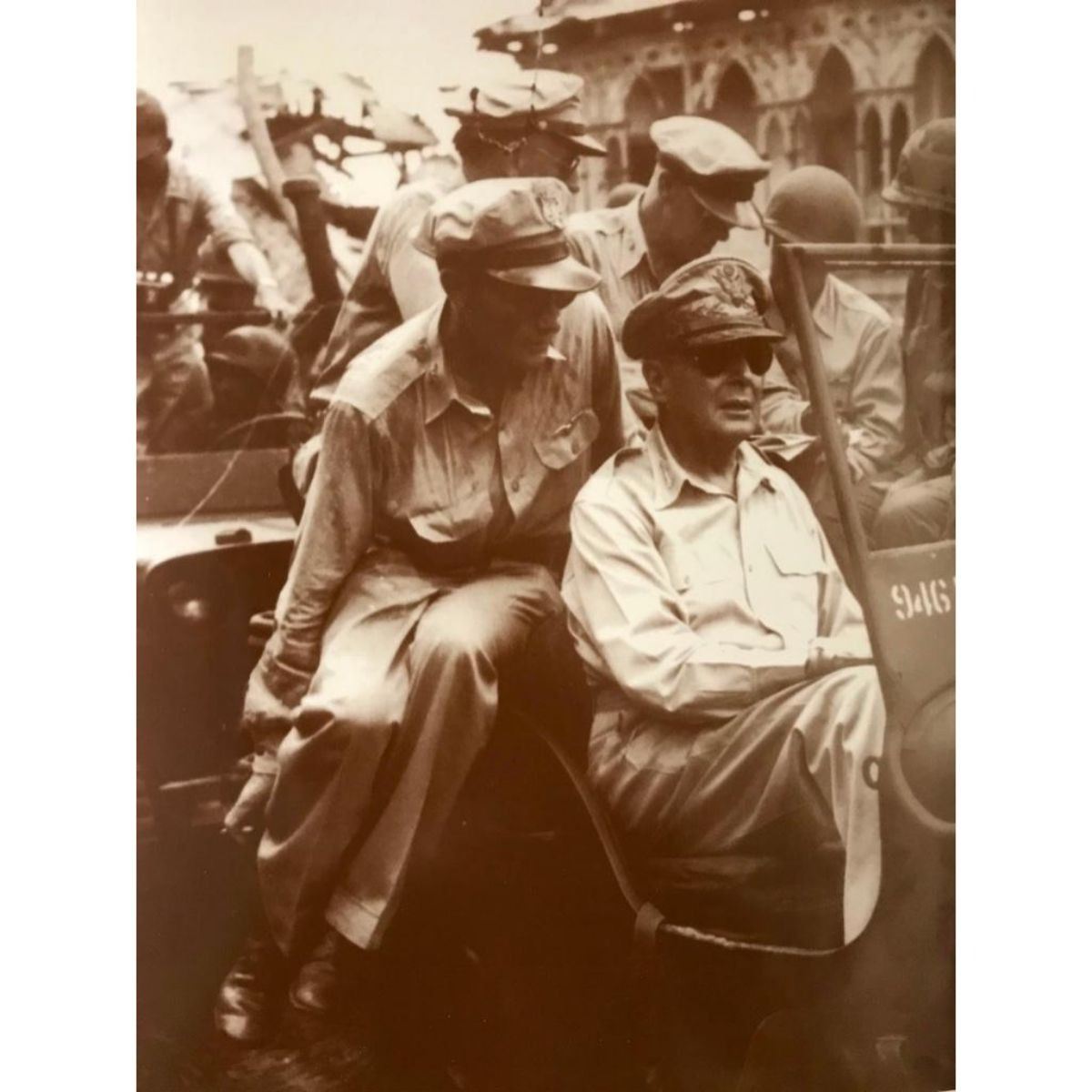 General Douglas MacArthur & aide Col Lloyd Lehrbas, 1944 sepia-tone photo print. Created in the early 1990's for The American Heritage Galleries. Printed on cardstock with original packaging.Â